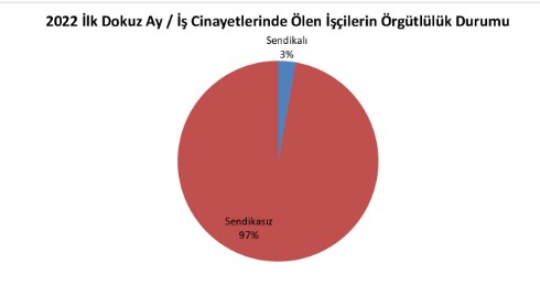 2022 yılının ilk dokuz ayında iş cinayetlerinde ölenlerin 39’u (yüzde 2,86) sendikalı işçi, 1320’si ise (yüzde 97,14) sendikasız. Sendikalı işçiler metal, belediye, kimya, sağlık, madencilik, enerji, taşımacılık, tarım, iletişim, eğitim ve güvenlik işkollarında çalışıyordu.