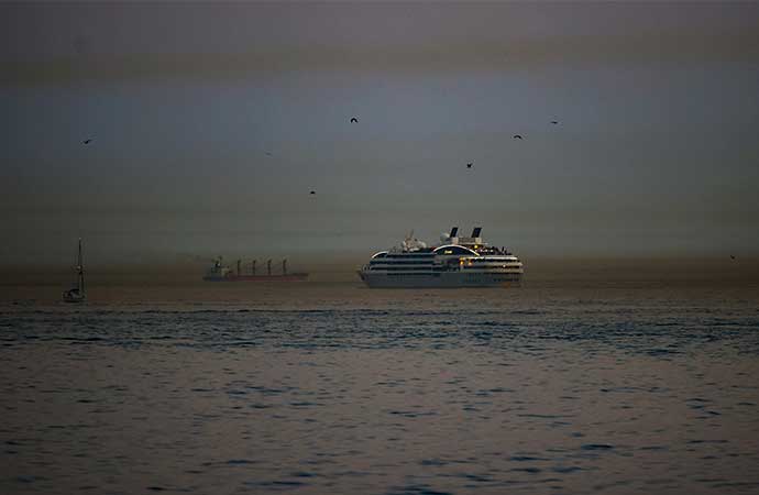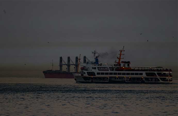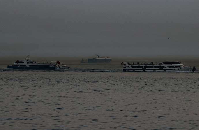 Boğazdaki gemilerin toz bulutu içerisinde ilerlediği görüldü.