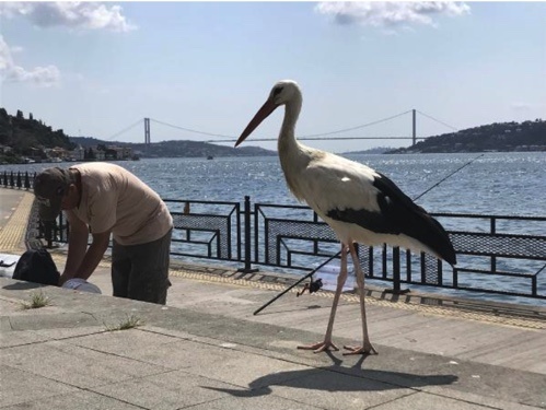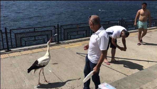 Acıktığında oltayla balık tutanların yanına giden leylek, ikram edilen balıkları yiyor.