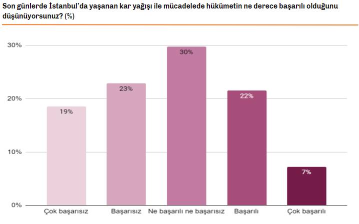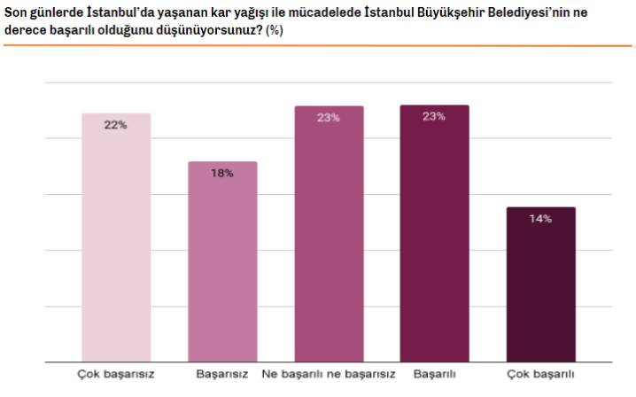 İstanbul Ekonomi Araştırma ve Danışmanlık Direktörü Can Selçuki, İstanbul için yapılan kar anketini açıkladı. 39 ilçede 800 kişi ile yapılan ankette karla mücadelede "İBB başarılı" diyenler yüzde 37, "Hükümet başarılı" diyenler yüzde 29, "Genel olarak yetkililer başarılı" diyenler ise yüzde 28 oldu. Anket sonuçları şöyle: