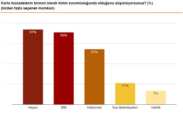 Ankete göre İstanbulluların yüzde 37'si, sorumluluğun tüm kurumlarda olduğunu ifade etti. Yüzde 35'lik kısım sorumluluk İBB'de derken yüzde 27'lik kısım ise sorumluluğun hükümette olduğunu söyledi.