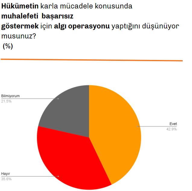 Hükümetin muhalefeti başarısız göstermek için "algı operasyonu" yaptığını düşünenlerin oranı yüzde 42.9 oldu. "Hükümet, muhalefeti başarısız göstermek için algı operasyonu yapıyor mu?" sorusuna "hayır" diyenlerin oranı ise yüzde 35.6 oldu.