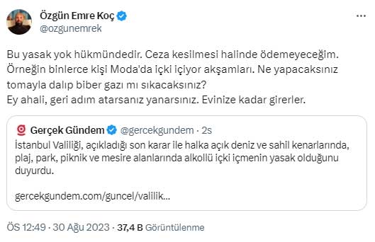 Özgün Emre Koç: Bu yasak yok hükmündedir. Ceza kesilmesi halinde ödemeyeceğim. Örneğin binlerce kişi Moda'da içki içiyor akşamları. Ne yapacaksınız tomayla dalıp biber gazı mı sıkacaksınız?