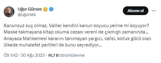 Uğur Gürses: Kanunsuz suç olmaz. Valiler kendini kanun koyucu yerine mi koyuyor? Maske takmayana kitap okuma cezası vereni de çıkmıştı zamanında...