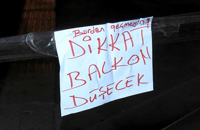 Bina sakinleri durumu belediye ekiplerine bildirdi. Ekipler, ilk incelemenin ardından balkonun bulunduğu alana şerit çekerek güvenlik önlemi aldı. Şeritlerin üzerine ise "Buradan geçmeyin. Dikkat balkon düşecek" şeklinde kağıda yazılı uyarı notu asıldığı görüldü.