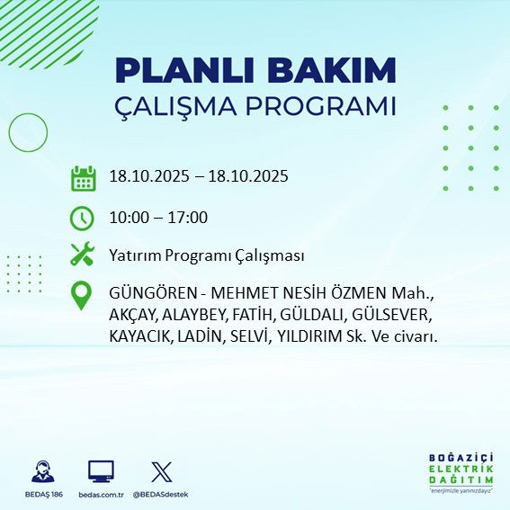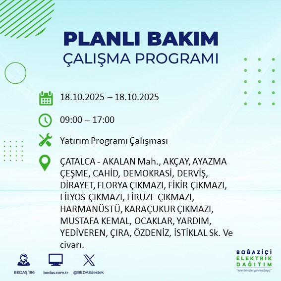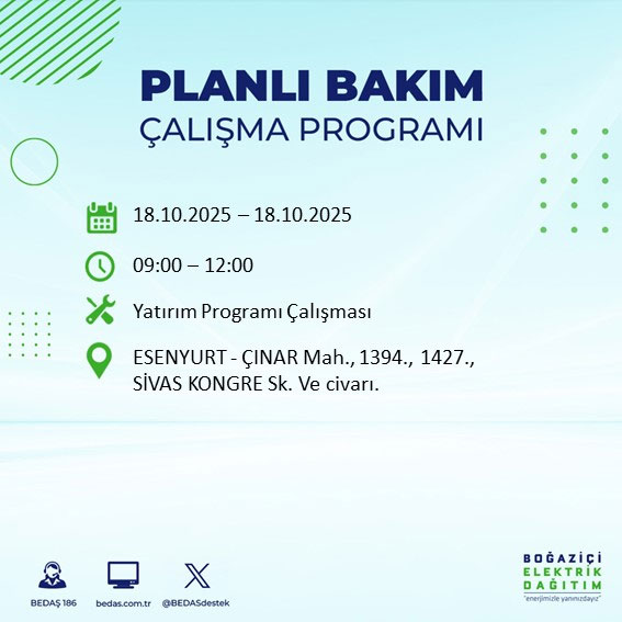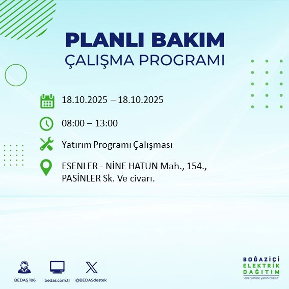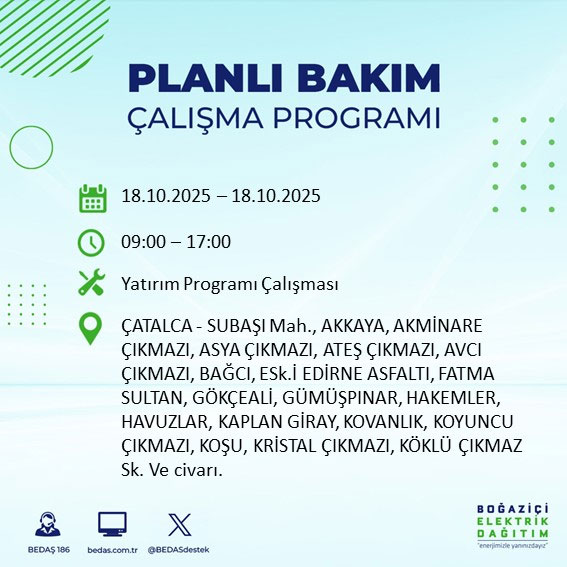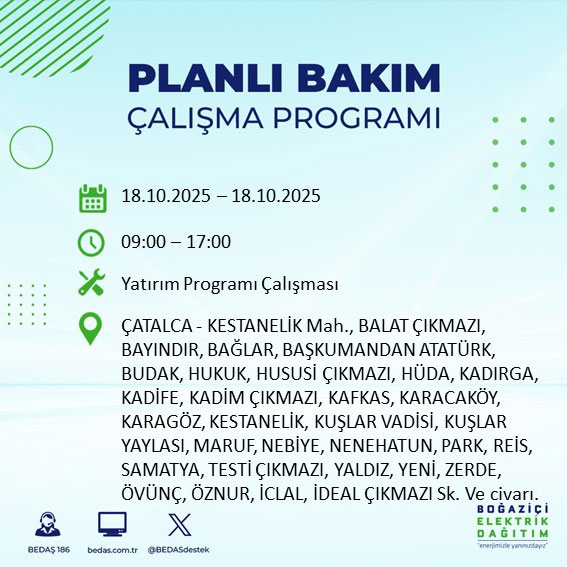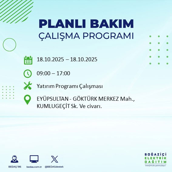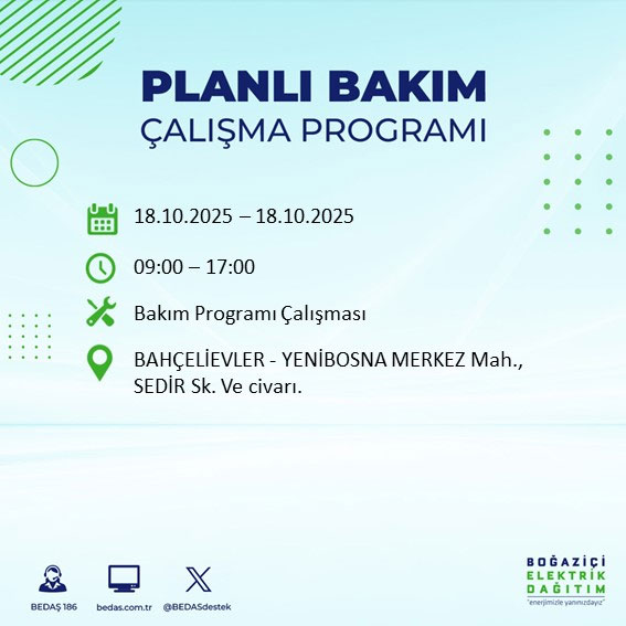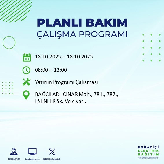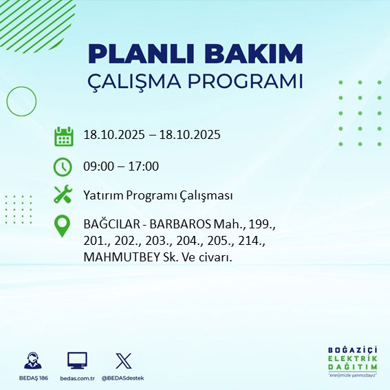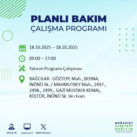 Boğaziçi Elektrik Dağıtım A.Ş, (BEDAŞ) Boğaziçi Elektrik Dağıtım A.Ş, (BEDAŞ) İstanbul'da 18 Ekim Cumartesi günü planlı bakım ve onarım çalışmaları nedeniyle elektrik kesintileri uygulanacak ilçe ve sokakları açıkladı.