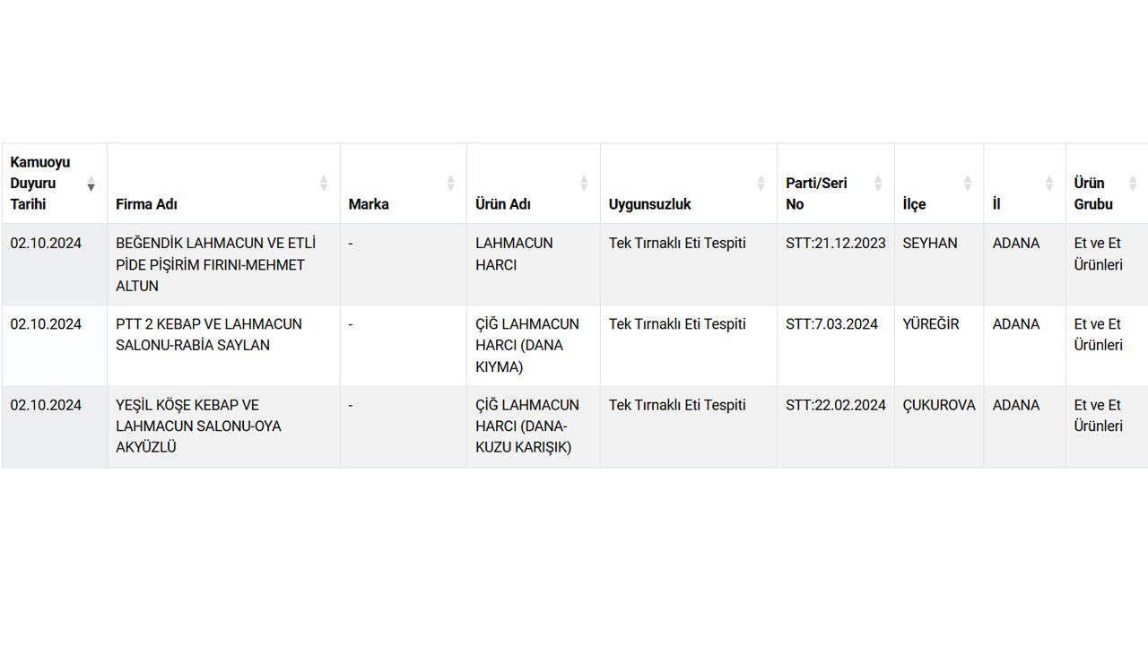 'Taklit veya Tağşiş Yapılan Gıdalar' listesinde yer alan lahmacuncular şu şekilde: