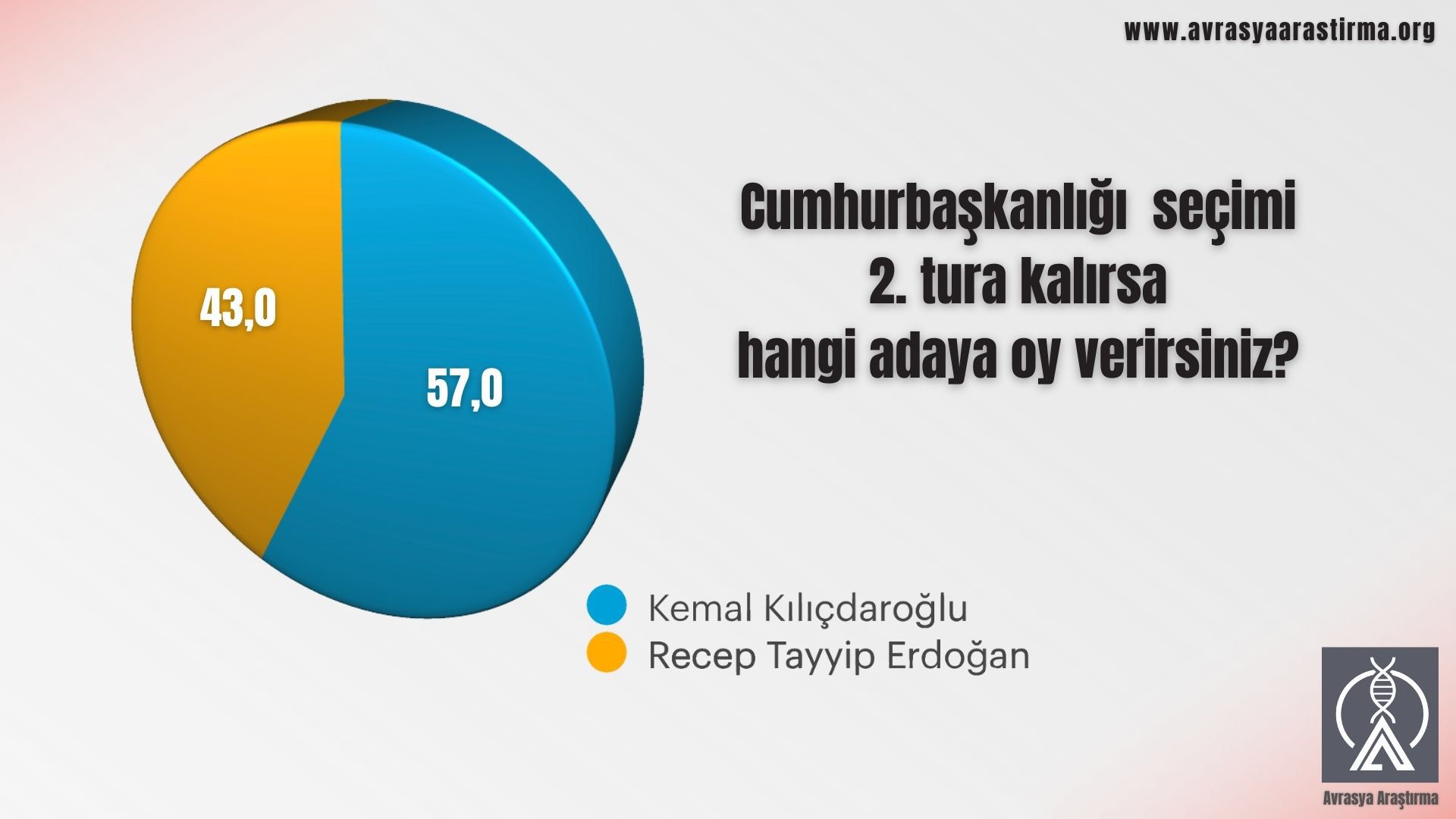 Cumhurbaşkanlığı seçimleri ikinci tura kalırsa kime oy verirsiniz sorusunda çıkan sonuçlarda ise Millet İttifakı'nın adayı Kemal Kılıçdaroğlu seçimi yüzde 57 ile kazanıyor.