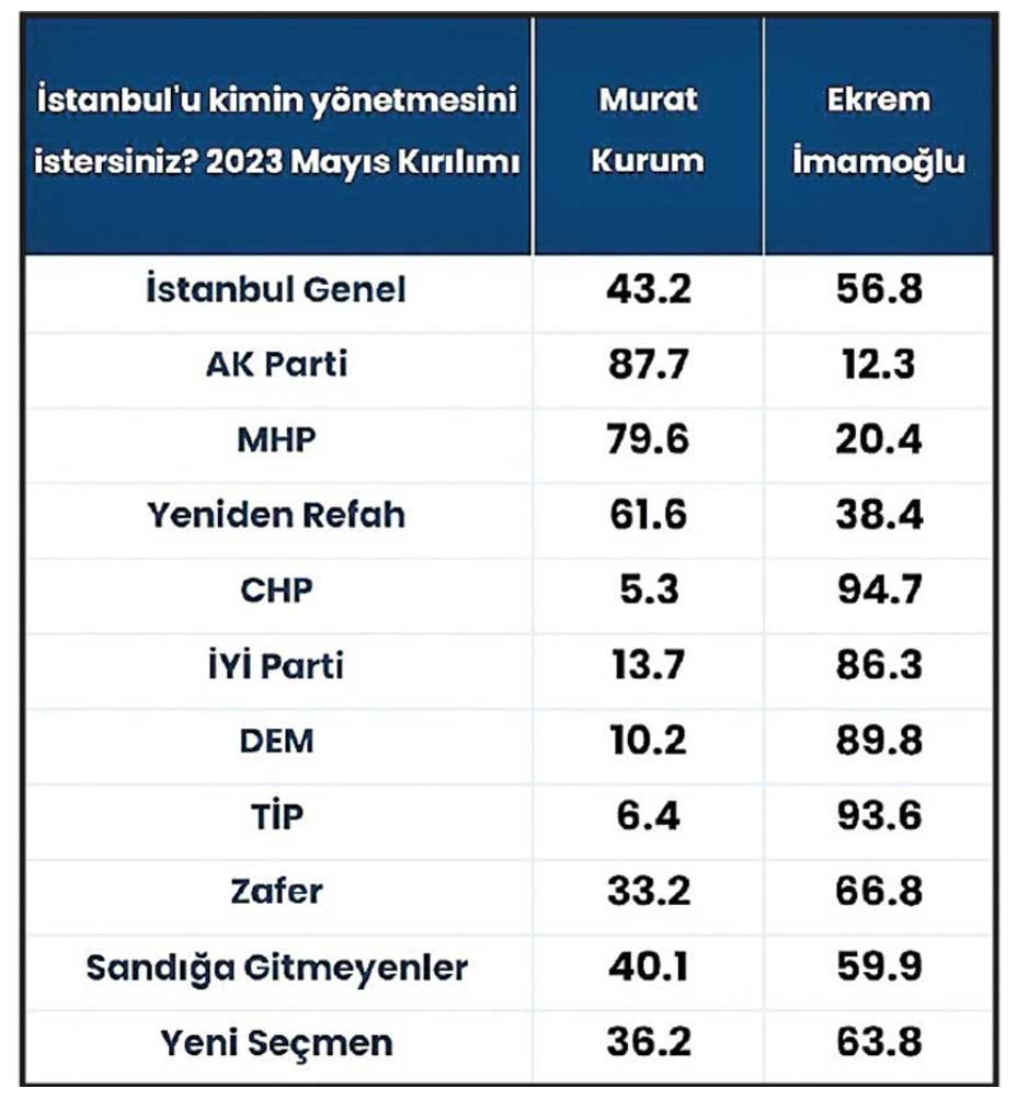 Ekrem İmamoğlu diyenler yüzde 56.8, Murat Kurum diyenlerse yüzde 43.2. Arada 13.4 fark var.