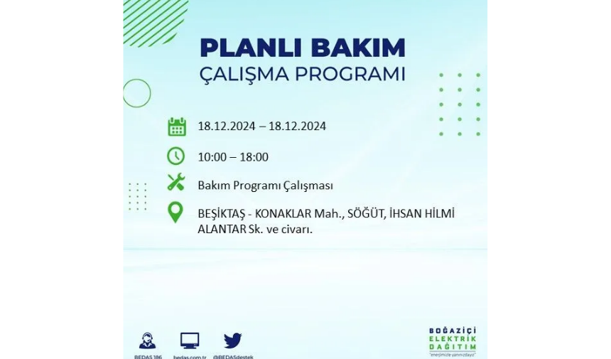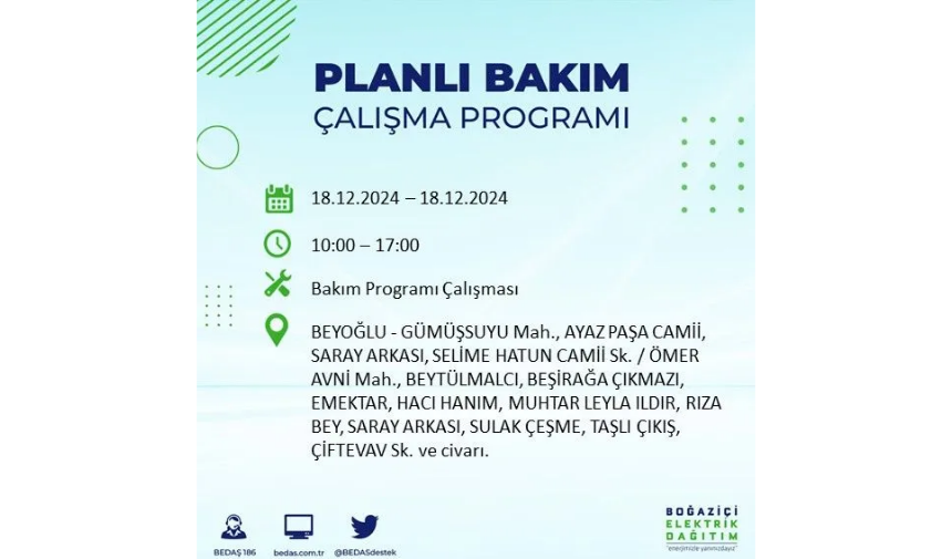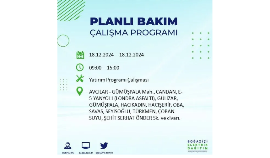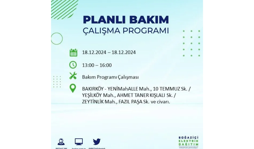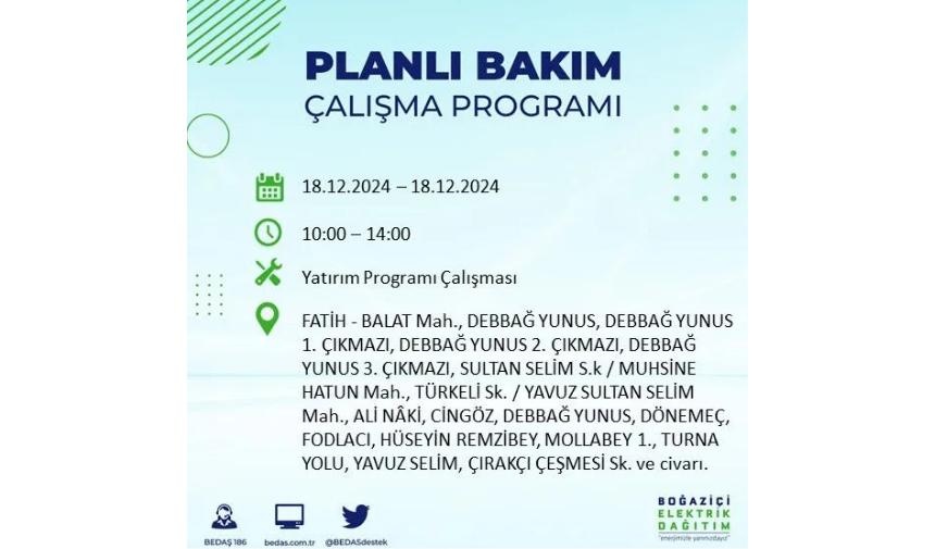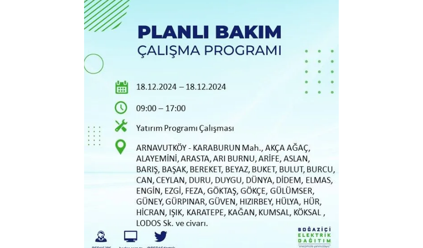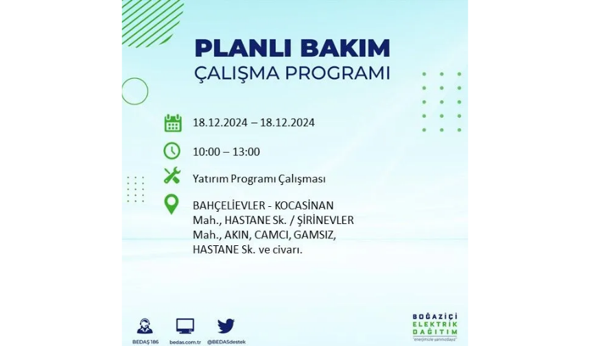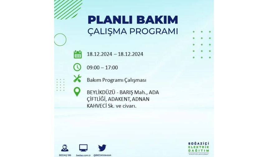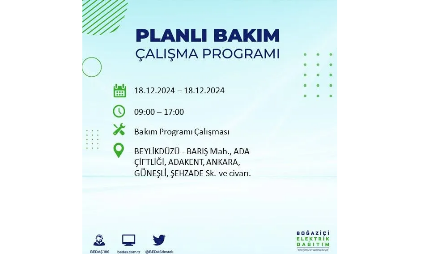Boğaziçi Elektrik Dağıtım A.Ş, (BEDAŞ), İstanbul'da planlı bakım çalışmaları kapsamında 18 Aralık Çarşamba günü elektrik kesintilerinin yapılacağı ilçe ve mahalleleri internet sitesi üzerinden duyurdu.
