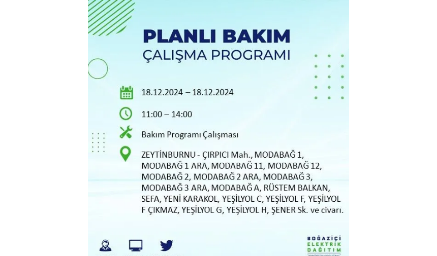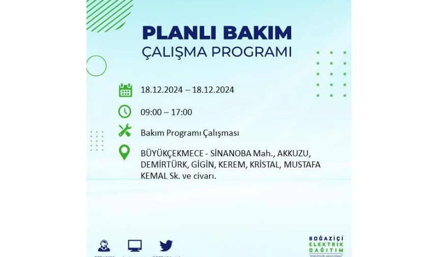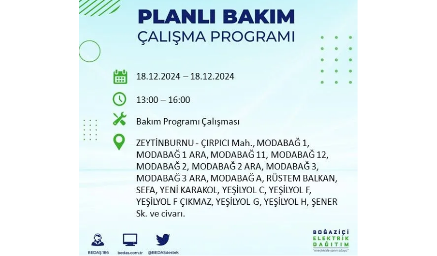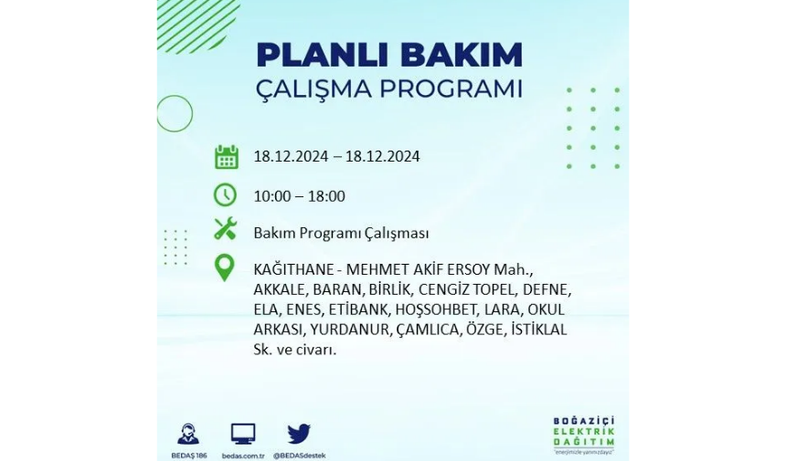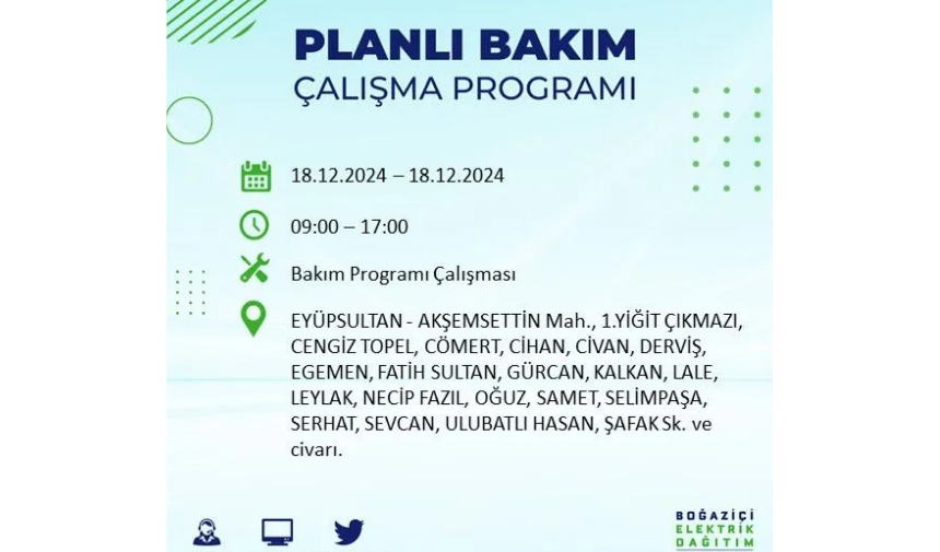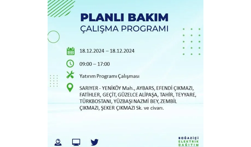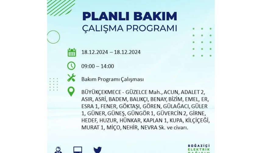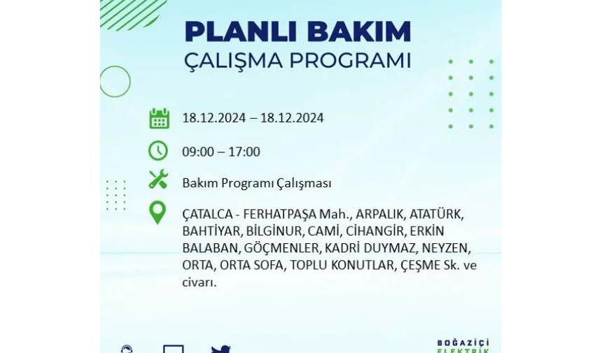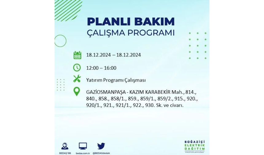 Boğaziçi Elektrik Dağıtım A.Ş, (BEDAŞ), İstanbul'da planlı bakım çalışmaları kapsamında 18 Aralık Çarşamba günü elektrik kesintilerinin yapılacağı ilçe ve mahalleleri internet sitesi üzerinden duyurdu.
