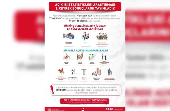 En fazla işçi talep eden sektörler ve en fazla işçi aranan meslekleri belirlemek amacıyla İŞKUR tarafından hazırlanan Açık İş İstatistikleri Araştırması'nın 2024 yılı birinci çeyrek sonuç raporunun yayımlandığını bildiren Işıkhan, "Araştırma kapsamında 1 ve üzeri çalışanı bulunan 17 bin 181 işletmeyle iletişime geçerek 330 bin 325 açık iş tespit ettik." ifadesini kullandı.