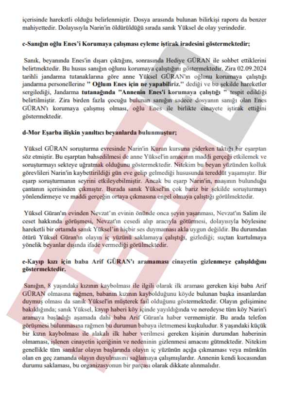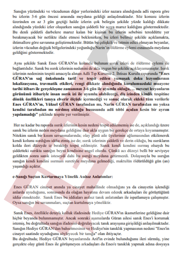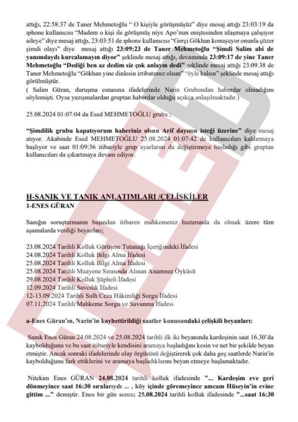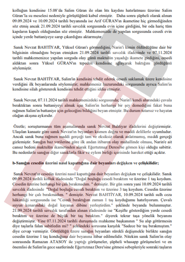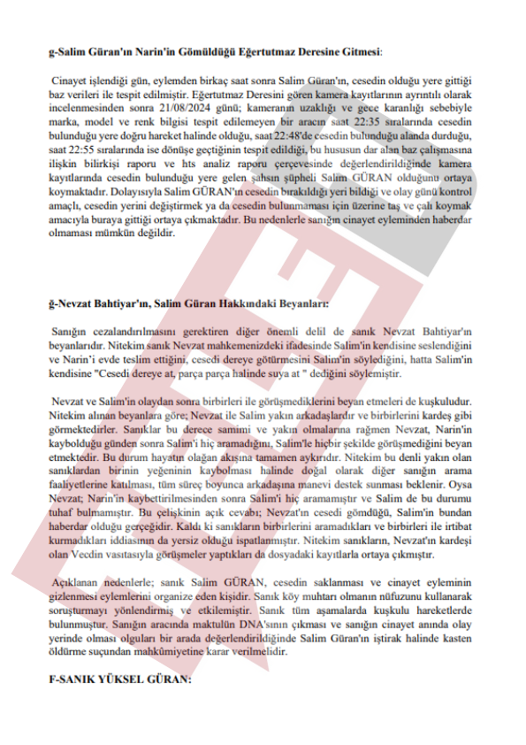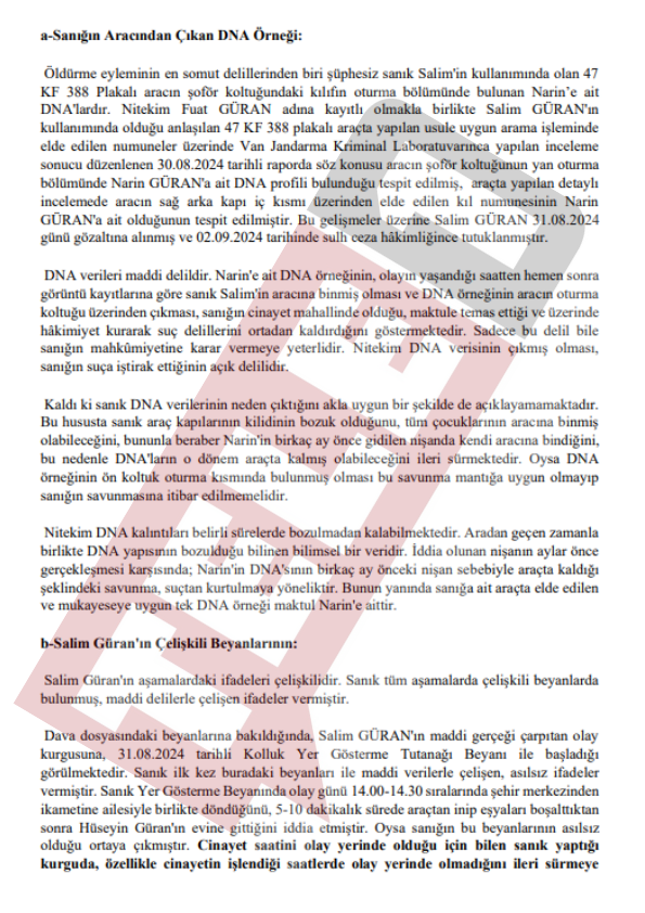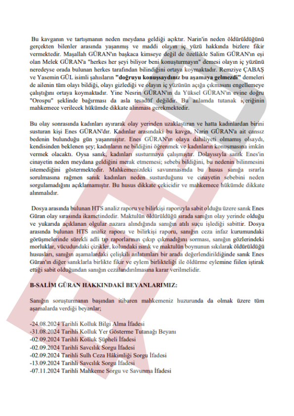 Diyarbakır'ın Bağlar ilçesine bağlı Tavşantepe Köyü'nde kaybolduktan 19 gün sonra cansız bedeni evine 1 kilometre uzaklıktaki Eğertutmaz Deresi'nde bulunan 8 yaşındaki Narin Güran'ın faillerinin bulunmasına ilişkin davada karar duruşmasında eski Diyarbakır Baro Başkanı Nahit Eren savcı mütalaasının ardından beyanda bulundu. Savcının tüm sanıkların suç ortağı olduğunu belirtmesinin ardından konuşan Nahit Eren, silinen telefon kayıtlarına ve PSA incelemesine dikkat çekti.