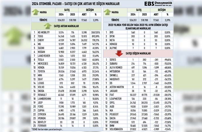 Satışı artan markalar şu şekilde: 1. KG MOBILITY - 2. TOGG - 3. CHERY - 4. MG - 5. SUZUKİ