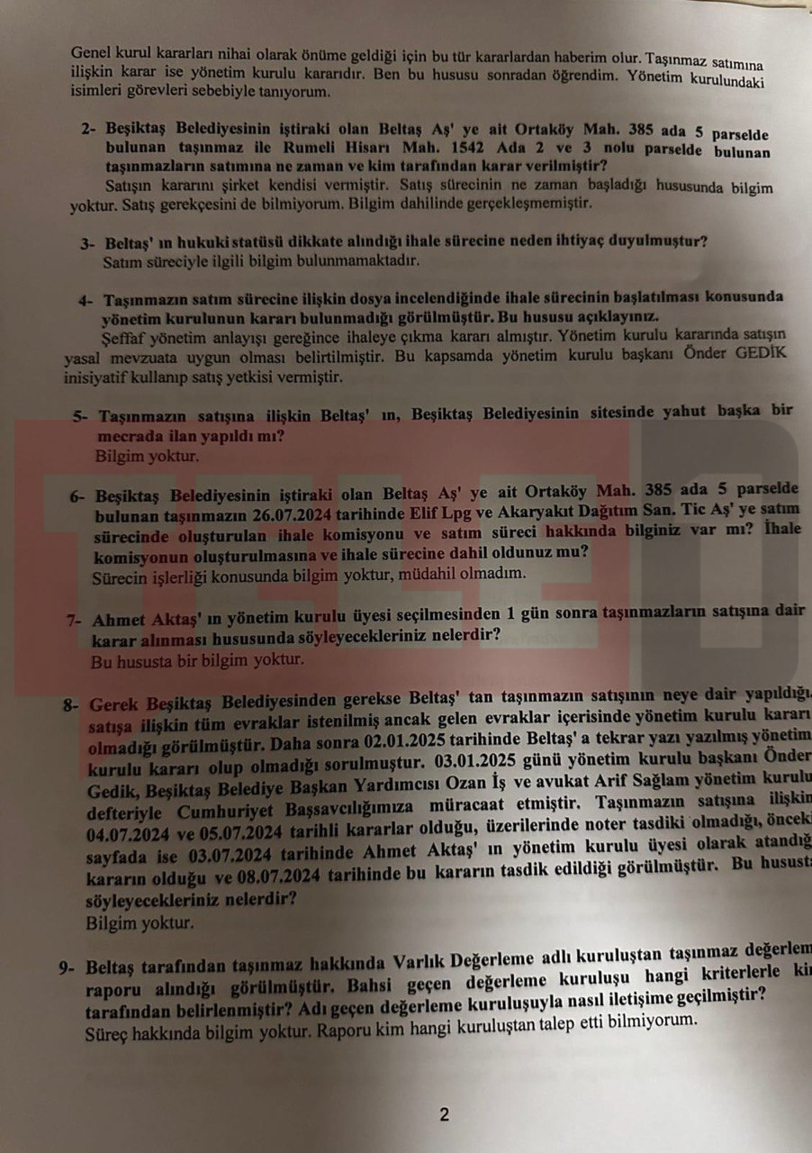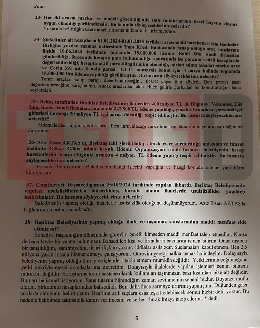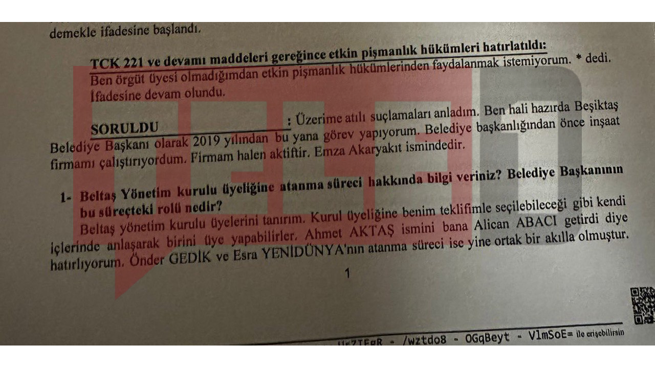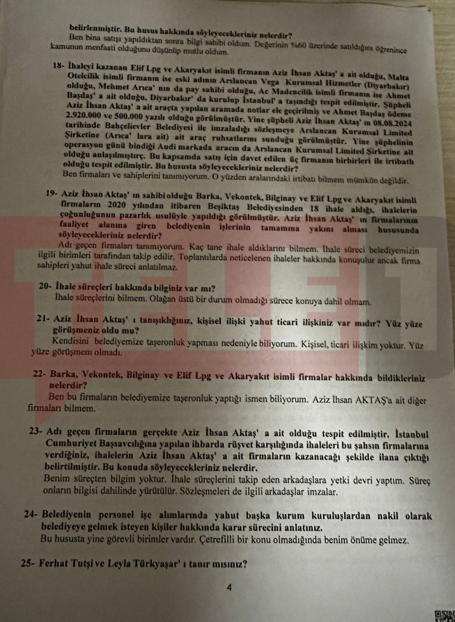 Öte yandan Akpolat'a savcılık sorgusunda sorulan sorulara TELE1 ulaştı. Akpolat ifadesinde, Aziz İhsan Aktaş’ı kişisel olarak tanımadığını söyledi. Akpolat, "Kendisi belediyemize taşeronluk yapması senediyle ismen biliyorum. Kişisel, ticari ilişkim yoktur. Yüz yüze görüşmem olmadı" dedi.
