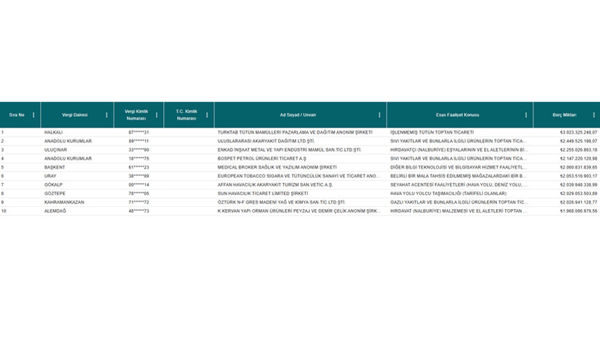"293 Sıra Nolu Vergi Usul Kanunu Genel Tebliği 1/B Bölümü Borçlu Mükellef Listesi"nin ilk 10'u şu şekilde: