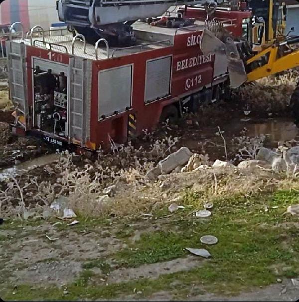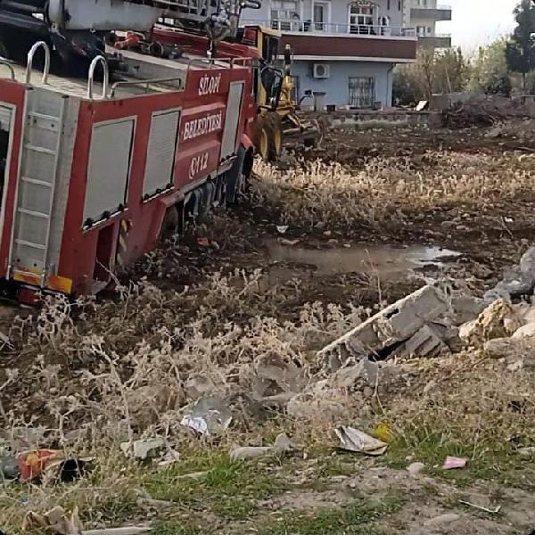 Yandaki araziden geçildiği sırada itfaiye aracı, çamura saplandı.
