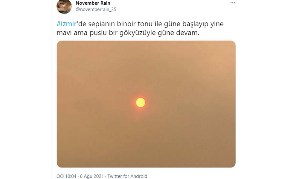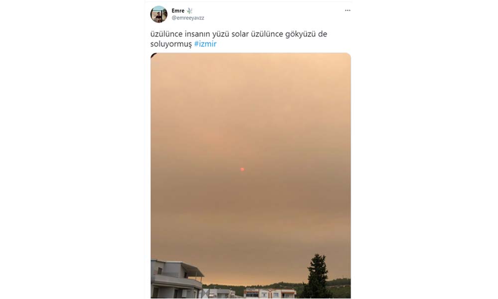 Anadolu Ajansı'nın haberine göre Muğla, Aydın ve bölgedeki diğer illerde bir süredir devam eden orman yangınlarının dumanı İzmir’de gökyüzünü kapladı. Kemalpaşa ilçesinde de dumanların güneşi kapattığı ve ışığın azaldığı görüldü.