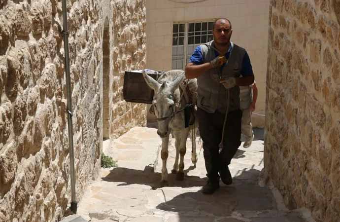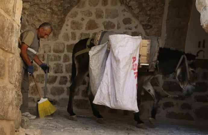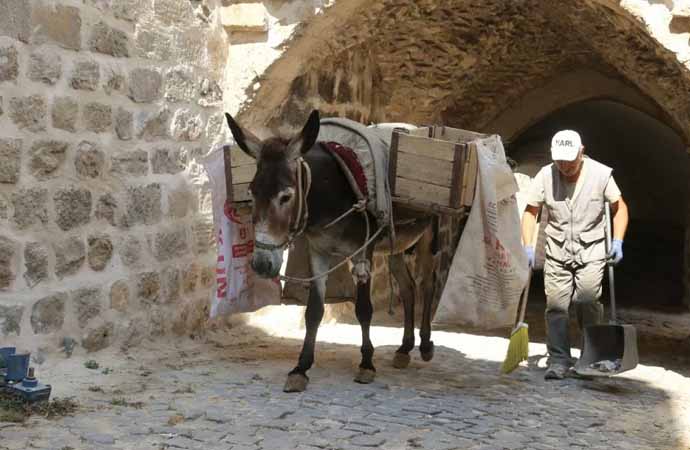 Mardin'in Artuklu ilçesinde sit alanındaki  araçların giremediği sokaklarda çöpler, belediye bünyesinde kadrolu çalıştırılan, sırtlarına kovalar bağlanan eşekler yardımıyla toplanıyor. Artuklu Belediyesi görevlileri, her sabah eşeklerin konakladığı Teker Mahallesi'ndeki "tavla" olarak tabir edilen alana gelerek gerekli hazırlıkları tamamlıyor. Sit alanındaki 24 mahallede temizlik görevlileri nezaretinde çöp taşıyan 24 eşek, günde ortalama 6 saat mesai yapıyor.Belediye tarafından bakımları düzenli yaptırılan eşekler, hizmet süreleri dolduğunda yaşamlarına belediye bünyesindeki barınakta devam ediyor. Kavurucu sıcaklar nedeniyle eşekler için de yaz mesaisi uygulanıyor. Fazla yük yüklenmeyen ve saat 11.00 ile 15.00 arasında dinlendirilen eşeklerin çalışma süreleri de 6 saatten 5 saate indirildi.