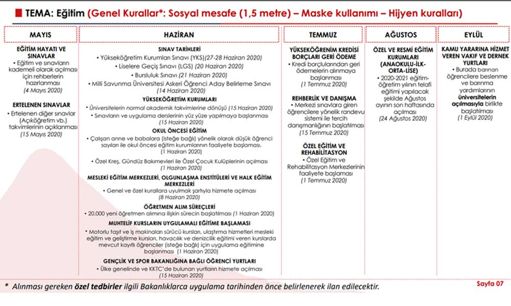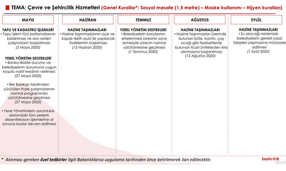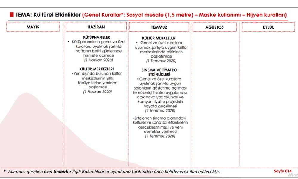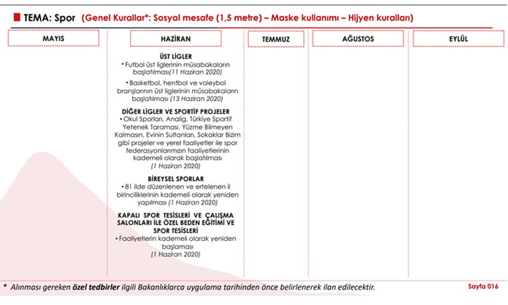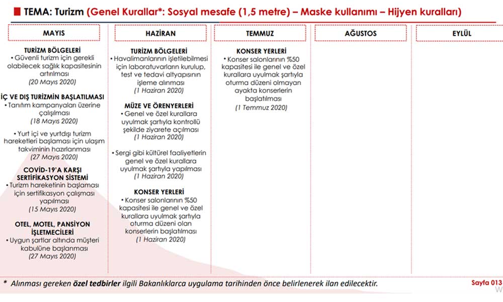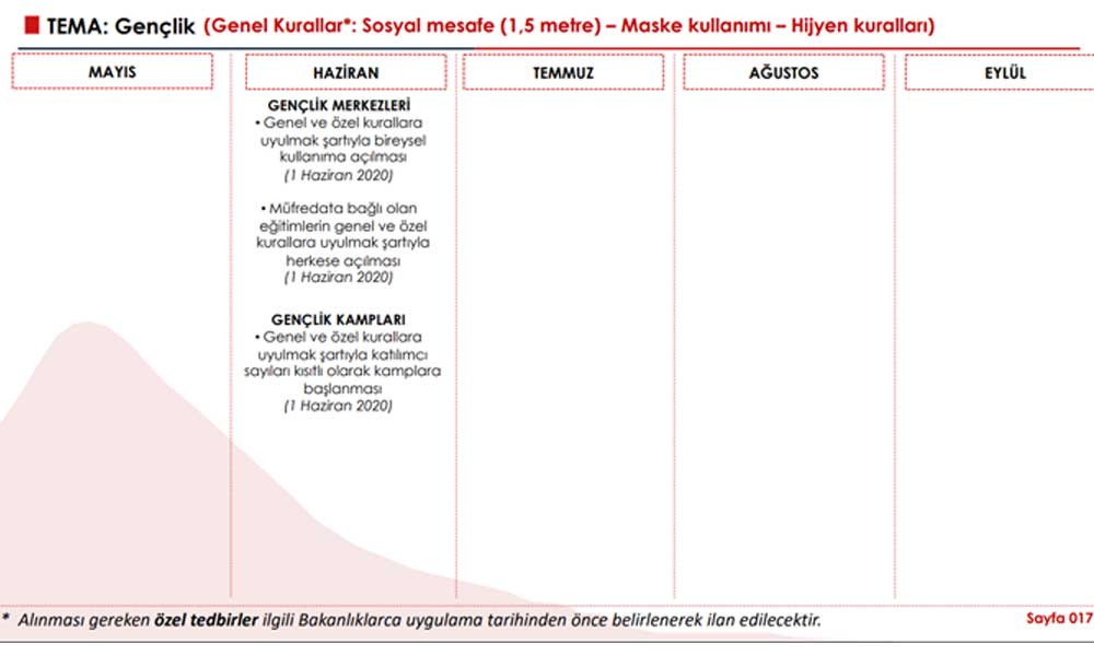 Cumhurbaşkanlığı Normalleşme Planı Takvimi'nde, "Umuma açık istirahat ve eğlence yerleri ile çay bahçesi, dernek lokalleri, yüzme havuzu, kaplıca ve spor merkezleri gibi tesislerin açılması (1 Haziran 2020)" olarak yer almıştır.