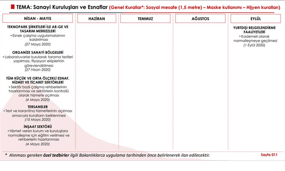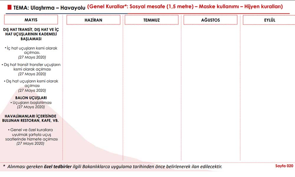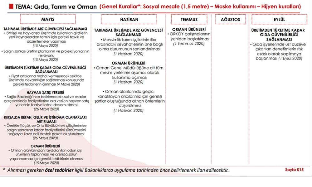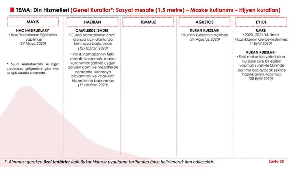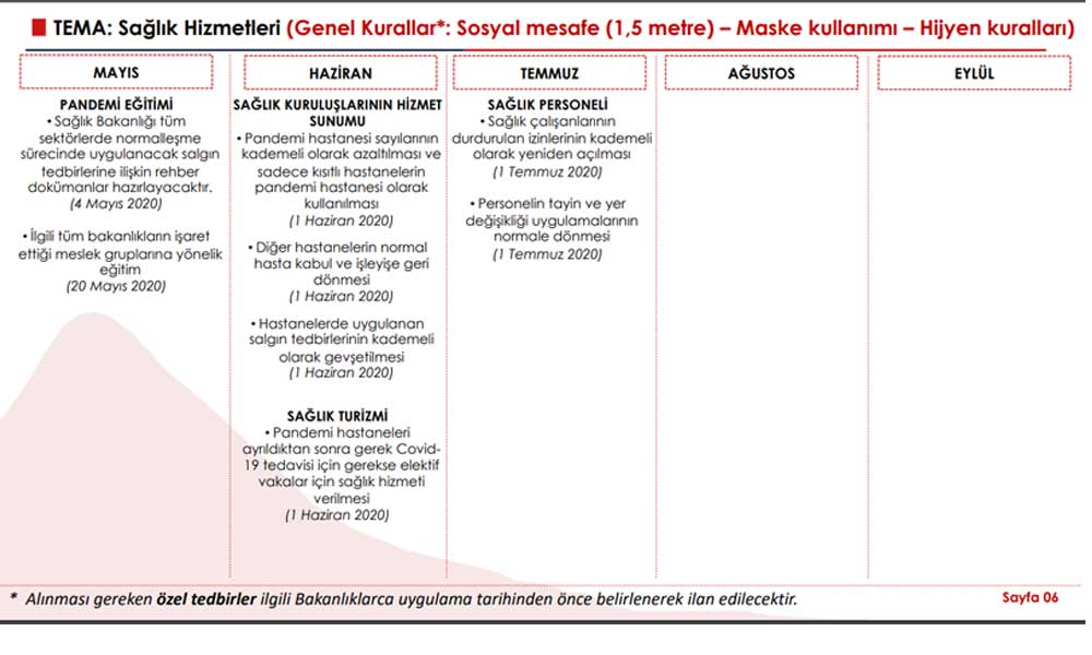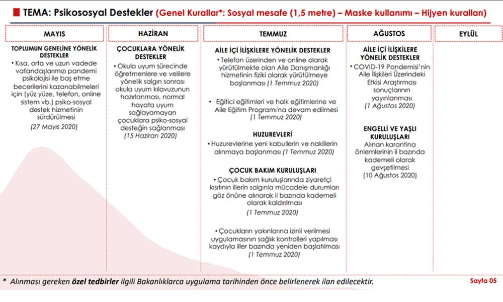 Cumhurbaşkanlığı Normalleşme Planı Takvimi'nde, "Umuma açık istirahat ve eğlence yerleri ile çay bahçesi, dernek lokalleri, yüzme havuzu, kaplıca ve spor merkezleri gibi tesislerin açılması (1 Haziran 2020)" olarak yer almıştır.