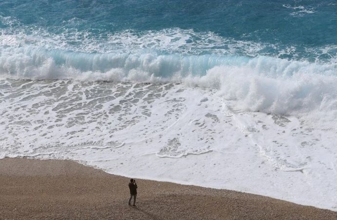 Yüksek dalgaların sahile vurmasıyla oluşan beyaz köpüklerin maviyle uyumu da güzel görüntü oluşturdu.