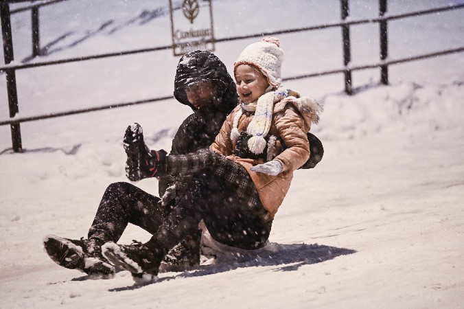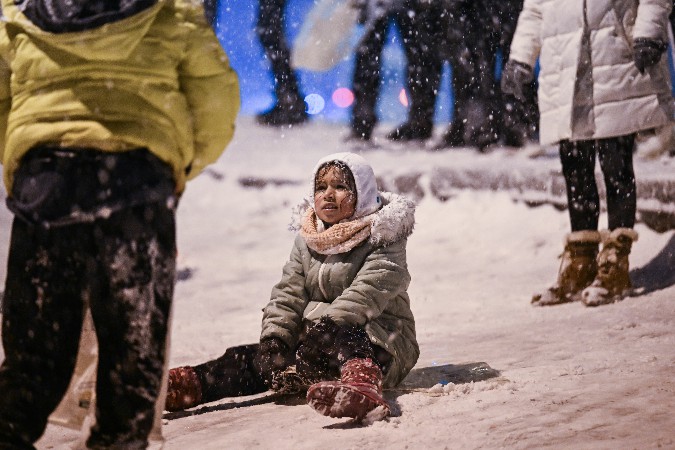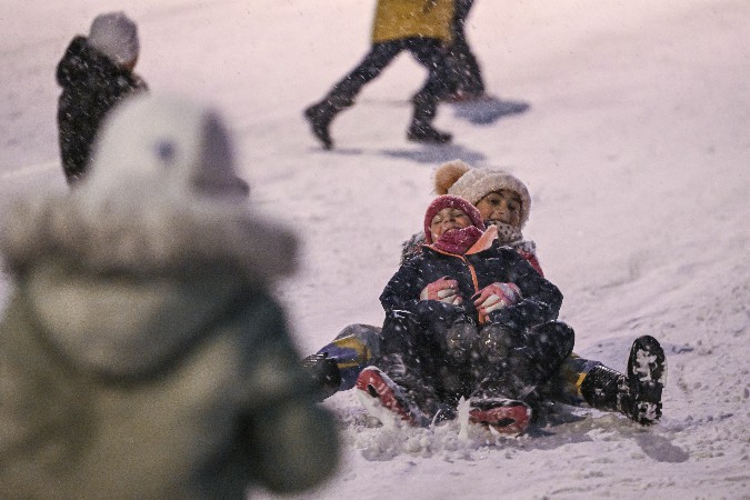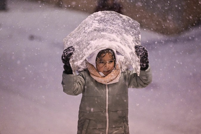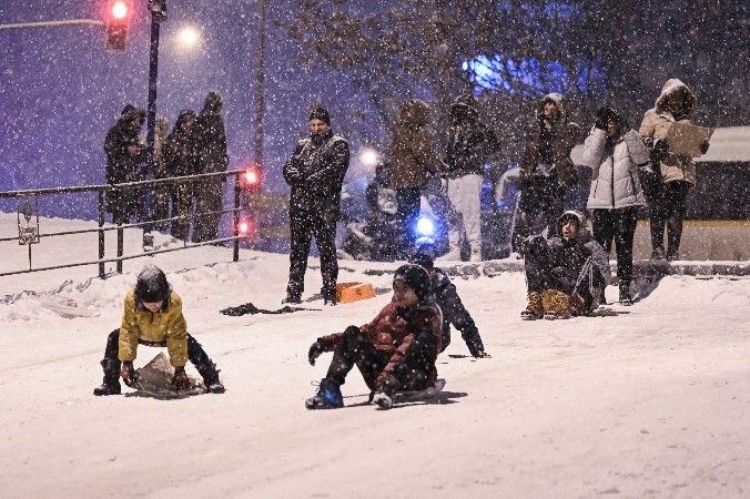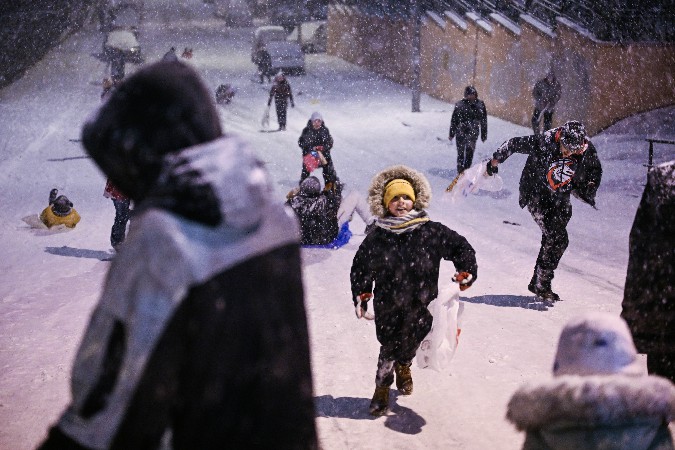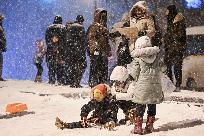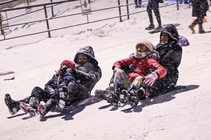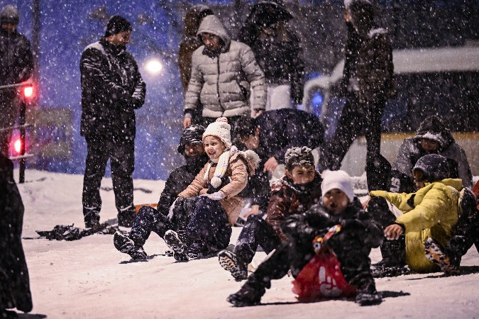 Çocuklar ise poşetlerle kayarak ve kar topu oynayarak eğlendi.
