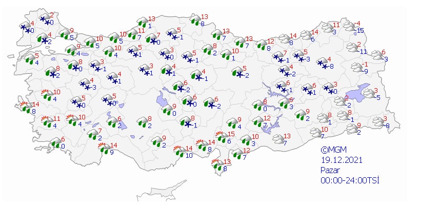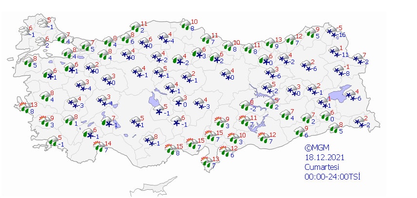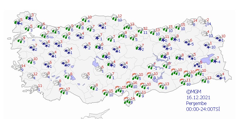 Genellikle yağmur ve sağanak, Kıyı Ege ve Akdeniz kıyılarında yer yer gök gürültülü sağanak, Toroslar Mevkii, Batı Karadeniz’in iç ve yüksek kesimleri ile Doğu Anadolu'da yer yer karla karışık yağmur ve kar şeklinde olması beklenen yağışların; bugün Kırklareli, Tekirdağ, Mersin, Konya, Karaman, Aksaray, Kırşehir ve Nevşehir, gece saatlerinde Adana, Adapazarı, Düzce, Zonguldak çevrelerinde kuvvetli (20-60 kg/m²), Antalya'nın doğusunda yer yer çok kuvvetli (50-85 kg/m²), Toroslar Mevkii’nde ise yoğun kar şeklinde olması bekleniyor.