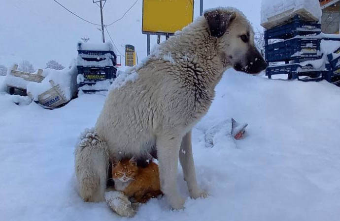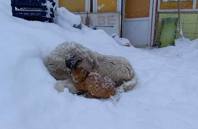 Önce kediyi yalayarak ısıtmaya çalışan köpek daha sonra kediyi kucağına alarak kar yağışından korunmasını sağladı