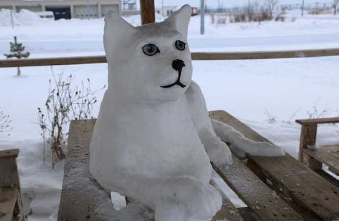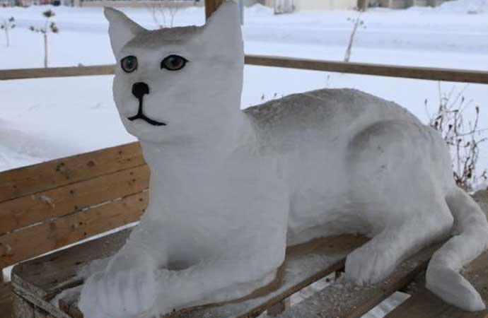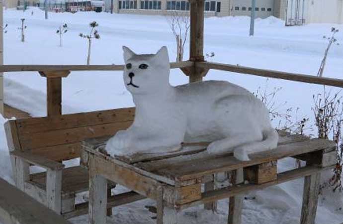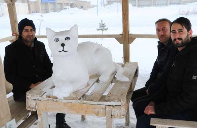 Kar kalınlığının 30 santimetreye ulaştığı ilçeye bağlı Yeni Mahalle'de bir araya gelen Ferhan Bakır, Yakup Durmaz ve Yakup İliş, bir evin bahçesindeki çardağın içeresinde bulunan oturma bankı üzerinde kardan 'Van kedisi' yaptı.