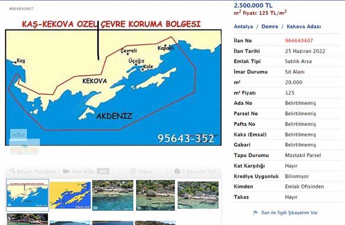Üzerine çivi dahi çakılmaması gereken adada müstakil tapulu 16 bin 273 metrekarelik zeytinlik için toplamda 1 milyon 627 bin TL talep ediliyor. Ada üzerindeki alanın zeytinlik olmasına rağmen 'Satılık Arsa' ibaresi dikkat çekiyor. Bir başka ilanda, Kaş-Kekova Özel Çevre Koruma Bölgesi'ndeki Kekova Adası'nda 20 bin metrekarelik arsa için 2,5 milyon TL isteniyor. İmar durumu sit alanı ve zeytinlik olmasına rağmen, 'Satılık Arsa' olarak gösteriliyor.