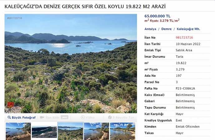 Başka bir ilanda 30 bin metrekare için 4 milyon TL fiyat belirlenmiş. Aynı şekilde zeytinlik alan emlak tipi olarak 'Satılık Arsa' olarak gösteriliyor. Kale Üçağız'da ise denize sıfır Kekova Adası manzaralı özel koyu olan 19 bin 822 metrekare tarla vasfındaki arazi için 65 milyon TL isteniyor.