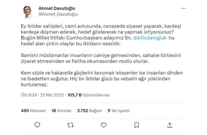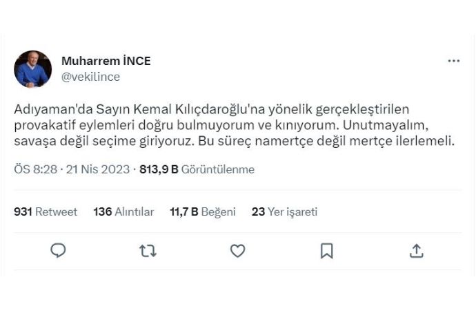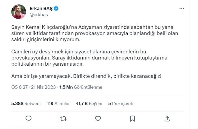 Daha sonra Kılıçdaroğlu, ziyaret için gittiği Adıyaman'da kendisine yönelik yapılan sözlü saldırıya ilişkin sosyal medya hesabından; "Mezarlıkta acılı insan her şeyi söyleyebilir, yapabilir; acısına vermek gerekir. Bugün bunları konuşmayalım, kayıplarımızı hakkıyla analım. Lütfen o insanımızı da ifşa edecek şeyler yapılmasın, özellikle sosyal medyada sorumlu davranalım. Benim hakkım varsa ben helal ettim" paylaşımını yaptı.
