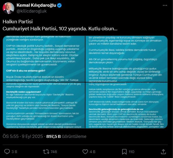 CHP'nin eski Genel Başkanı Kemal Kılıçdaroğlu, CHP'nin kuruluşunun yıl dönümü dolaysıyla sosyal medyadan dört sayfalık paylaşım yaptı. Kılıçdaroğlu'nun paylaşımında 'altı ok' vurgusuna yer verildi.