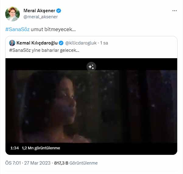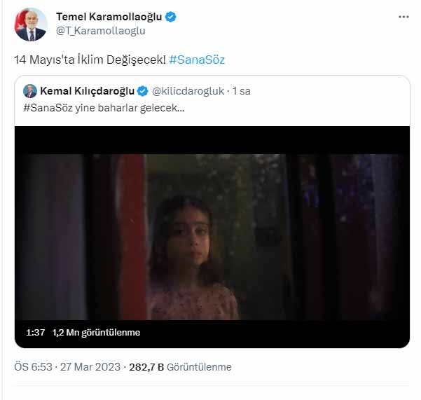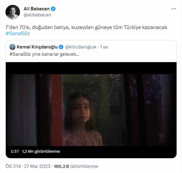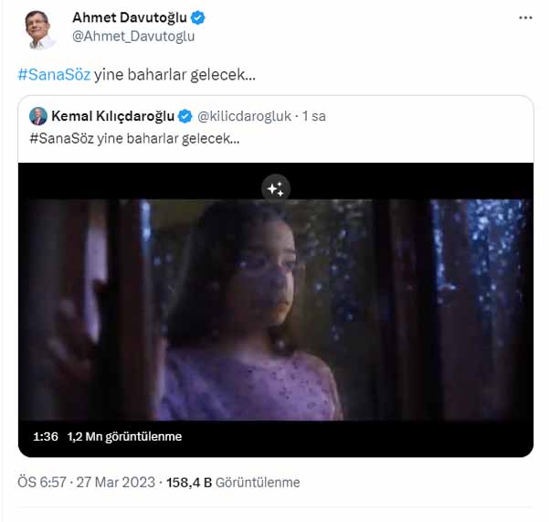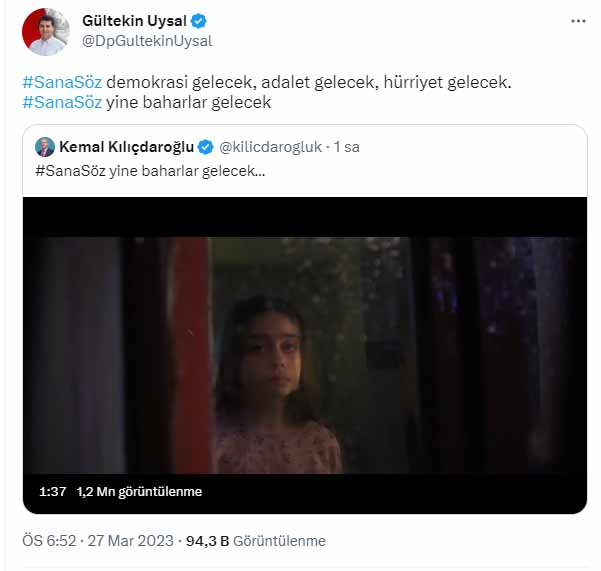 Millet İttifakı'nın Cumhurbaşkanı adayı Kemal Kılıçdaroğlu, sosyal medya hesabından paylaştığı video ile adaylık kampanyasının resmi başlangıcını yaptı. Millet İttifakı'nın 5 lideri de Kılıçdaroğlu'nun kampanya filmini sosyal medya hesaplarından paylaştı. Kılıçdaroğlu, sosyal medya hesabından "#SanaSöz yine baharlar gelecek…" başlığı ile video paylaştı. Cumhurbaşkanlığı kampanyasının ilk filmi olan videoda, Kılıçdaroğlu'nun Ekrem İmamoğlu ve Mansur Yavaş ile el ele olduğu görüntülere de yer verildi. Millet İttifakı'nın beş genel başkanı ile birlikte kayıtlara geçen görüntülerin de birleştirdiği videoyu Kılıçdaroğlu, "Sana söz, yine baharlar gelecek. Bay Kemal sözünden dönmeyecek" ifadeleriyle bitirdi.