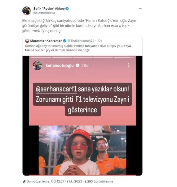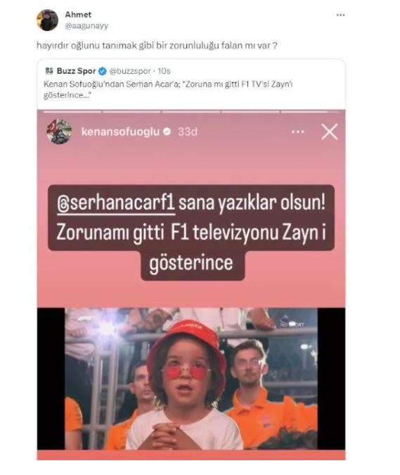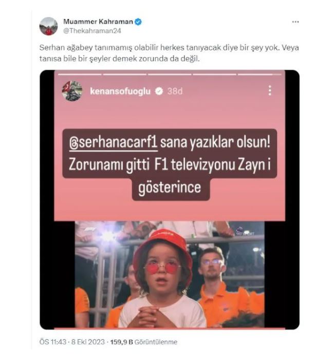 Kenan Sofuoğlu, Instagram hesabından bir paylaşım yaparak Formula 1 sunucusu Serhan Acar'a tepki gösterdi.