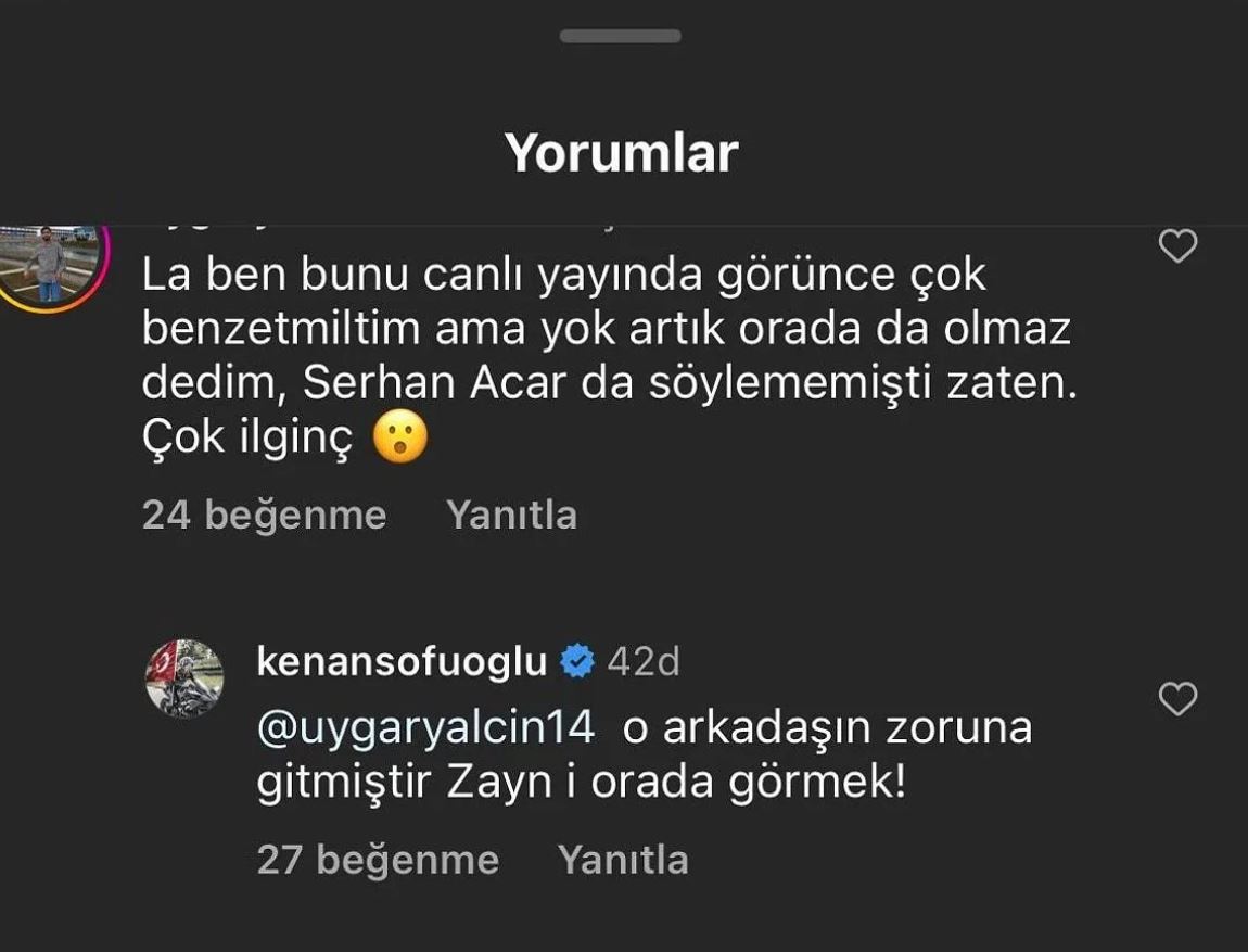 Sofuoğlu daha sonra bir takipçisinin yorumuna da "O arkadaşın zoruna gitmiştir Zayn'ı orada görmek" yanıtını verdi.