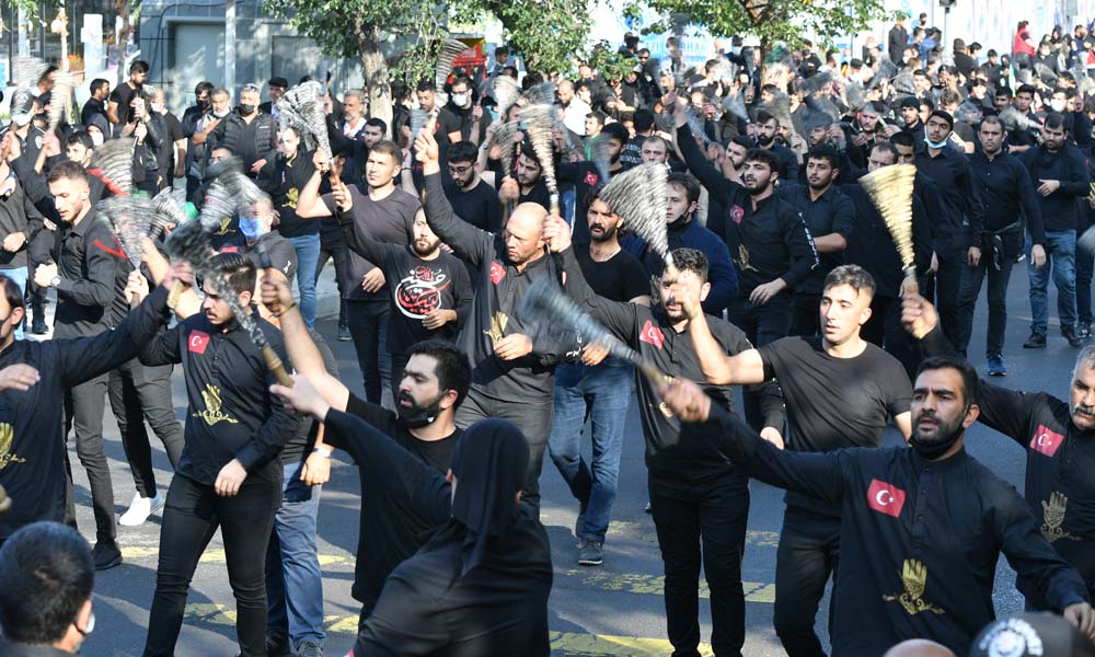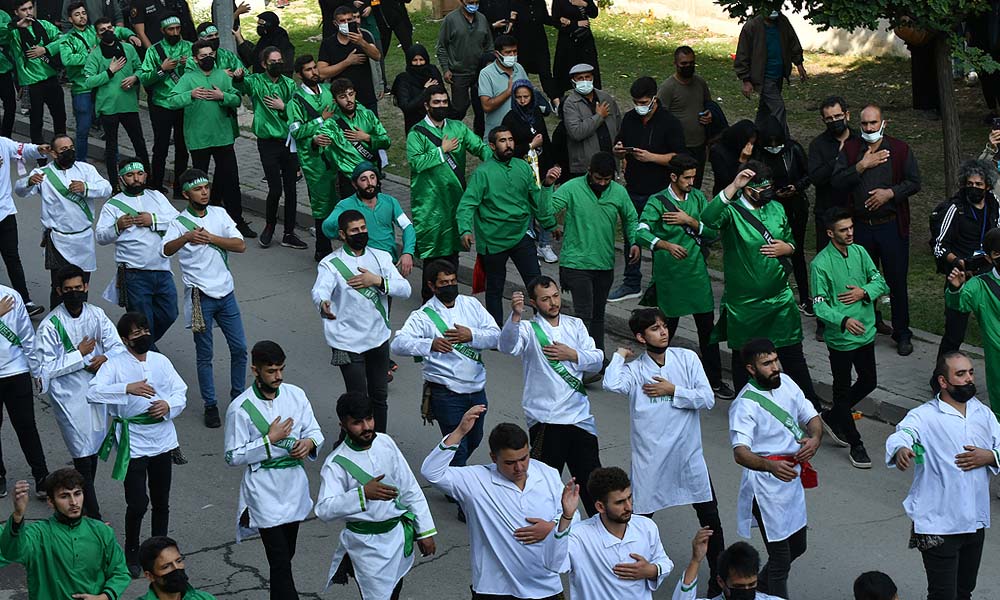 Gruptakiler, Faikbey Caddesi'nden Merkez Ehlibeyt Camisi önüne kadar mersiyeler eşliğinde sine dövüp, vücutlarına zincir vurdu. Okunan mersiyelerde bazı vatandaşlar gözyaşlarını tutamadı. Siyah elbise giyen kadınlar, ellerinde zülfikar kılıçlarıyla yürüyüşe katıldı.