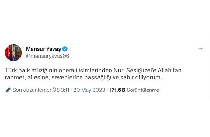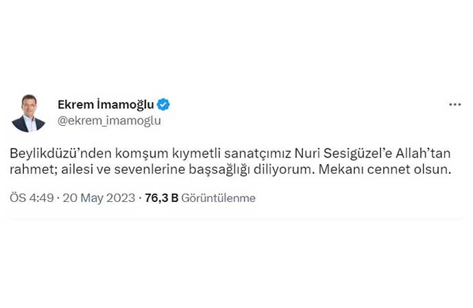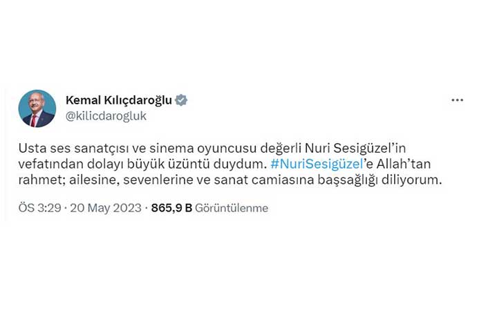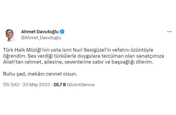 Millet İttifakı Cumhurbaşkanı Adayı Kemal Kılıçdaroğlu, Cumhurbaşkanı Yardımcısı Adayı Ekrem İmamoğlu, Cumhurbaşkanı Yardımcısı Adayı Mansur Yavaş ve Gelecek Partisi Genel Başkanı Ahmet Davutoğlu da Nuri Sesigüzel için başsağlığı mesajı yayınladı.