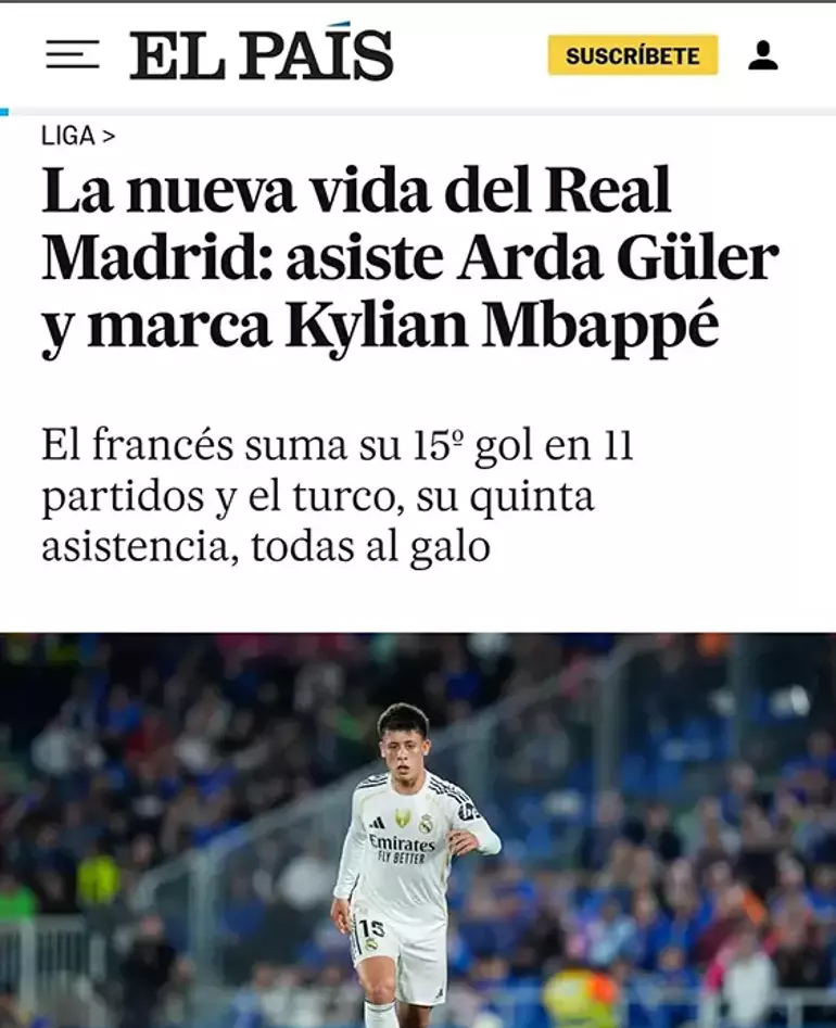 EL PAIS: Real Madrid'in yeni hayatı: Arda Güler asist yapıyor, Kylian Mbappe gol atıyor. Fransız oyuncu 11 maçta 15. golünü atarken, Türk oyuncu da 5. gol pasını verdi. Real’de tehdit değişmedi. Ne golcü ne de asist. Güler pas verdi ve Mbappe attı.