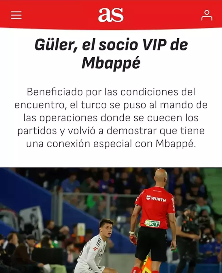 AS: Mbappe'nin VIP ortağı Güler. Real, üretkenlikte zorlanan durgun bir görüntüdeydi. Ta ki Güler sahaya çıkana kadar. Türk futbolcu, maçların pişirildiği operasyonların başına geçti ve Mbappe ile arasındaki özel bağı bir kez daha ortaya koydu.