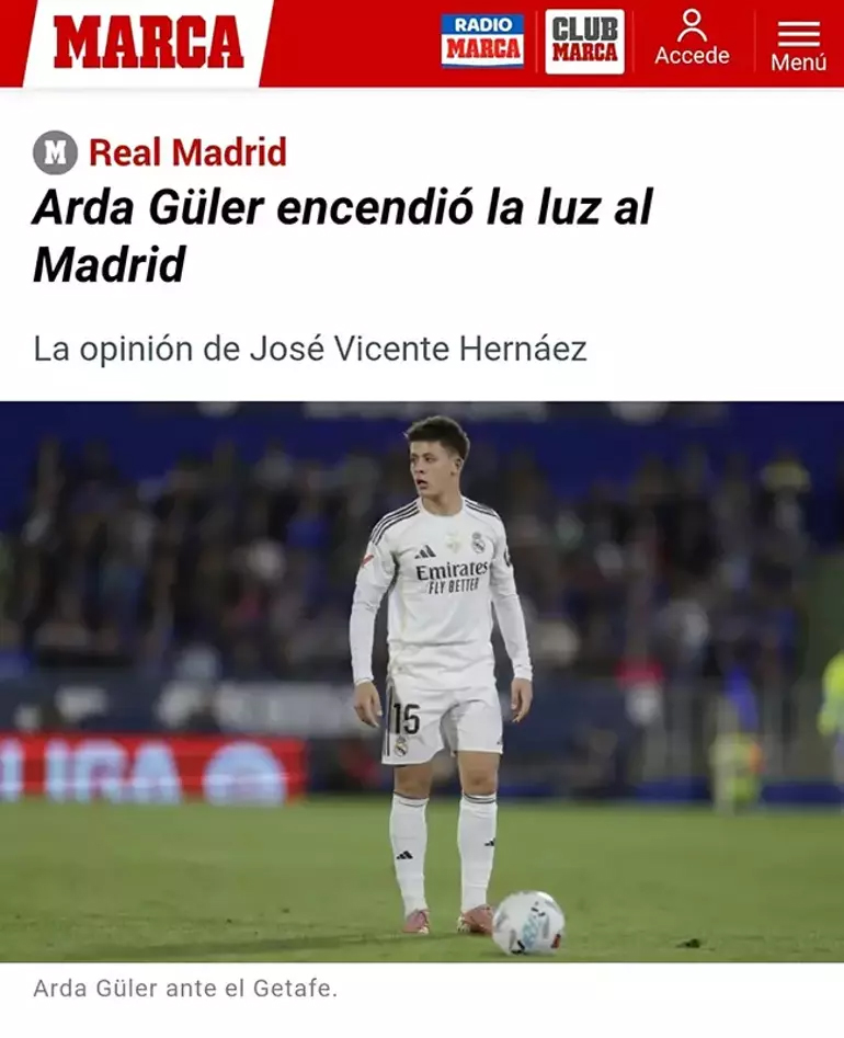 MARCA: Arda Güler, Madrid'e ışık tuttu. Maç tehlikeli bir şekilde 0-0'da gidip geliyordu. Ta ki Arda Güler oyuna girene kadar. Arda sahaya adımını atar atmaz Mbappe'ye golün asistini yaptı, takımlarına galibiyeti getiren gol geldi.