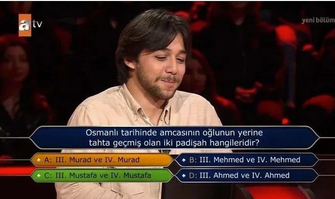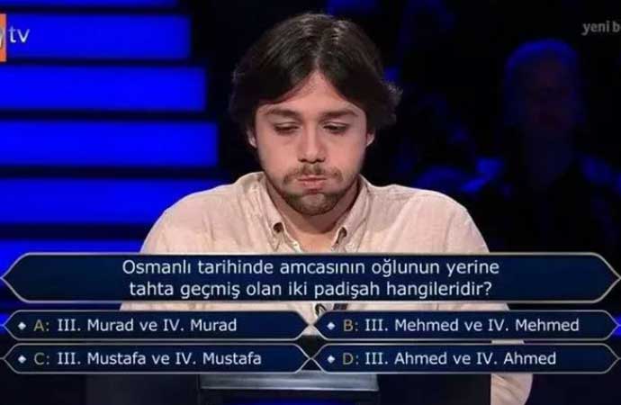 Yarışmaya katılan Aybatur Kıvanç isimli yarışmacının karşısına, "Osmanlı tarihinde amcasının oğlunun yerine tahta geçmiş olan iki padişah hangileridir?" sorusu çıktı.
