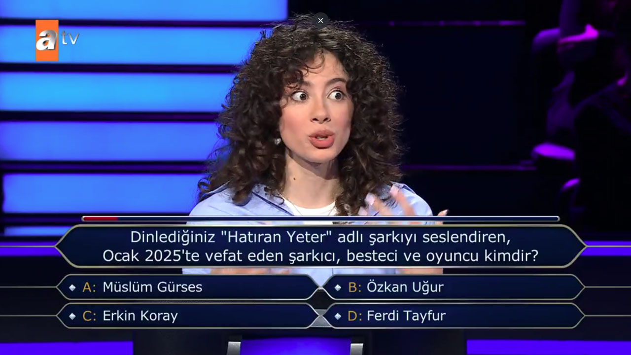 "Şarkı çalmaya başladığında çok korktum. Çünkü; hiçbir fikrim yoktu. Ama "Ocak 2025'te vefat eden..." kısmı var ya... Babaannemlerin evine gitmiştim, onlarda televizyon izleniyordu. Onlar çok fazla bahsettiler, onların sayesinde bu soruyu yapıyorum. O yüzden onlara inanılmaz minnettarım. Ama... Herhalde başka biri vefat etmemiştir Ocak 2025'te, değil mi?"