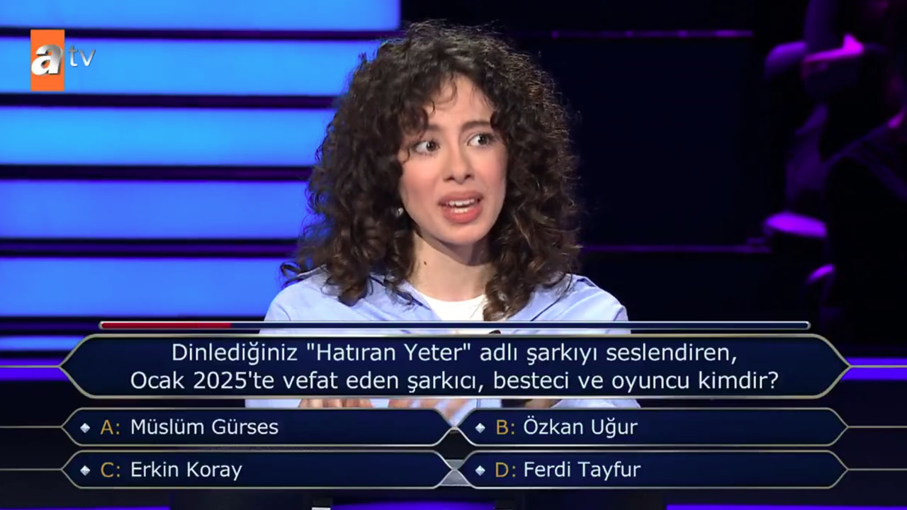 Yarışmacı, "D) Ferdi Tayfur" diyerek soruyu doğru yanıtladı.