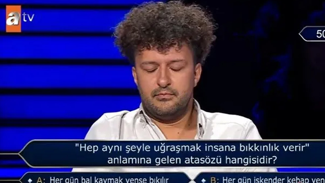 500 bin TL'lik 11'inci soruda yarışmacının karşısına, "Hep aynı şeyle uğraşmak insana bıkkınlık verir anlamına gelen atasözü hangisidir?" sorusu çıktı.