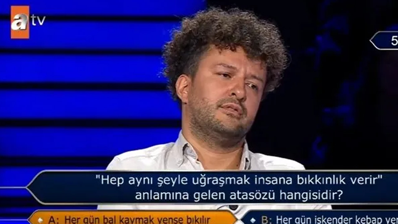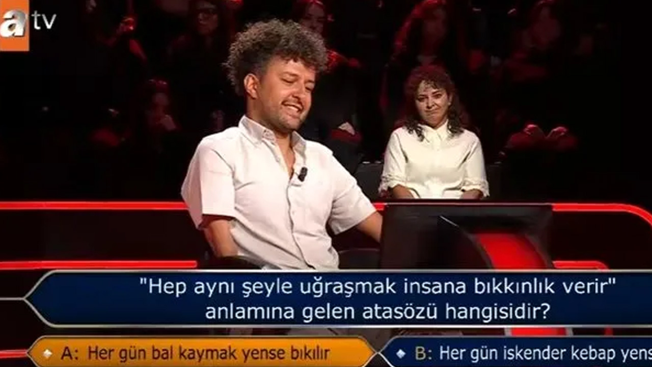 Uzun süre düşünen yarışmacı soruya, 'A- Her gün bal kaymak yense bıkılı' cevabını verdi. Büyük bir risk alan yarışmacı, doğru cevabın 'D- Her gün baklava börek yense bıkılır' olduğunu görünce büyük bir hayal kırıklığı yaşadı.
