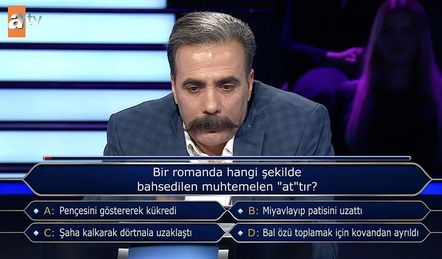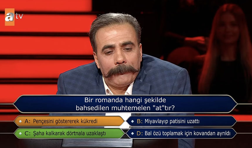 Mehmet Bey'e sorulan ilk baraj sorusu "Bir romanda hangi şekilde bahsedilen muhtemelen "at"tır?" sorusu soruldu.