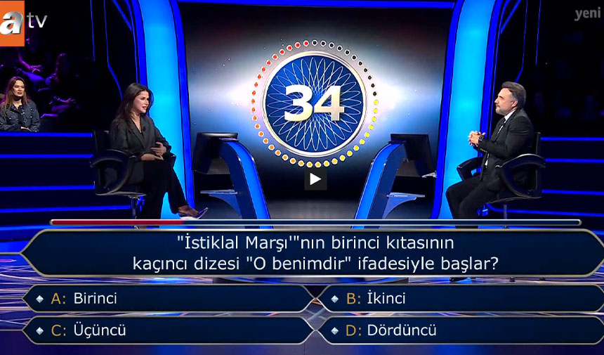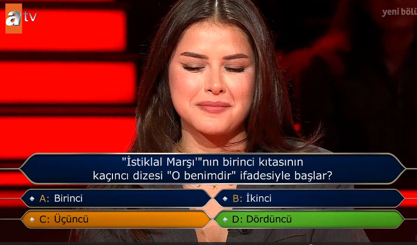 Beşinci soruda, "İstiklal Marşı'nın birinci kıtasının kaçıncı dizesi 'O benimdir' ifadesiyle başlar?" sorusu soruldu. Yarışmacı soruya, 'C- Üçüncü' cevabını verdi.
