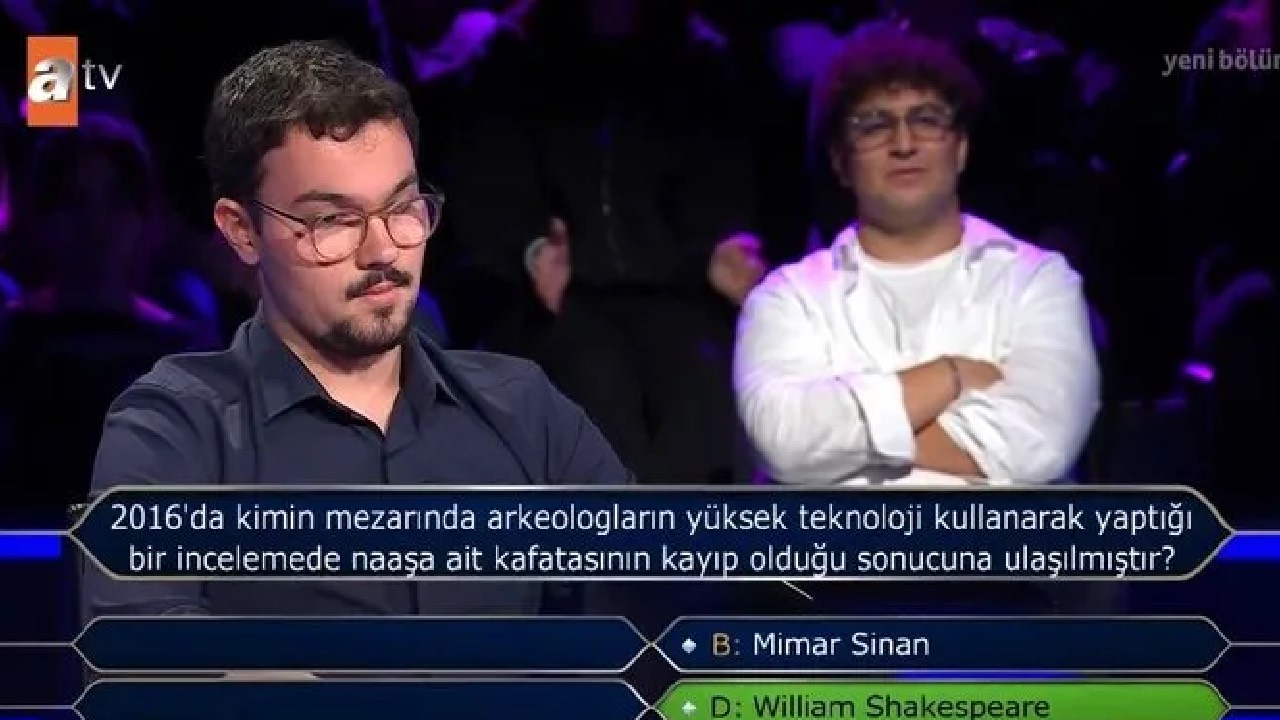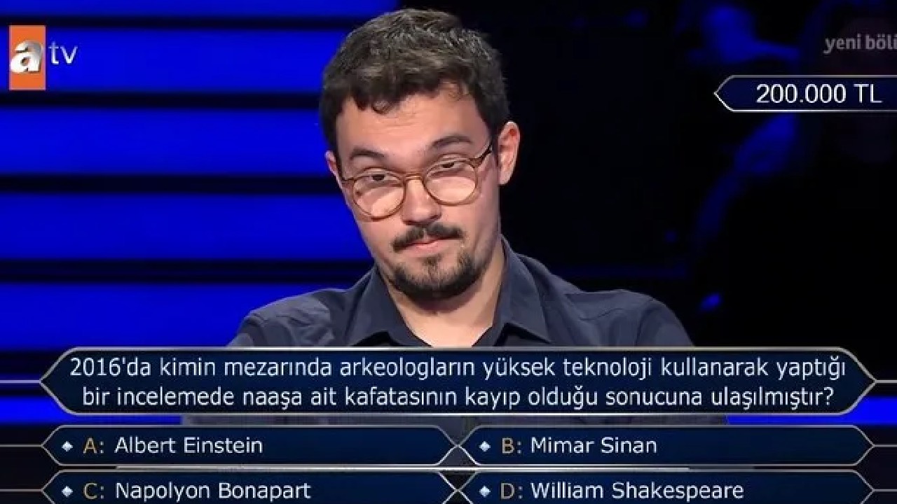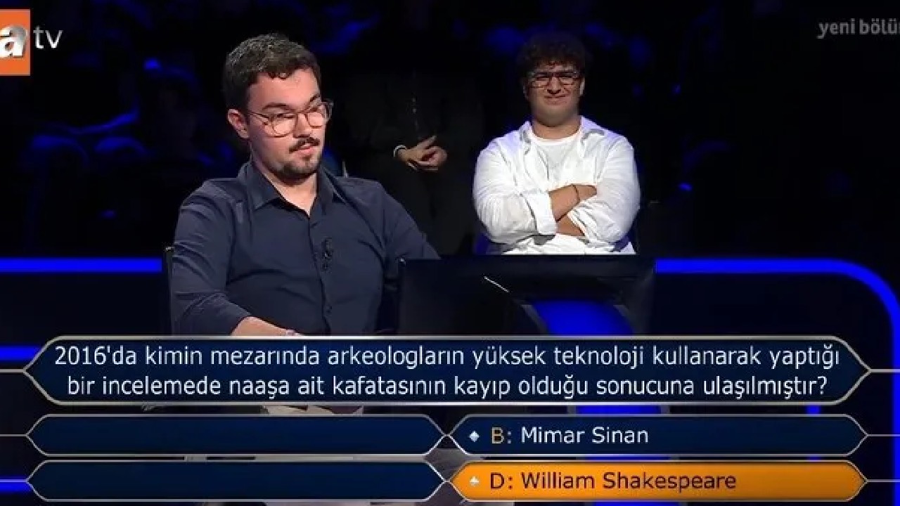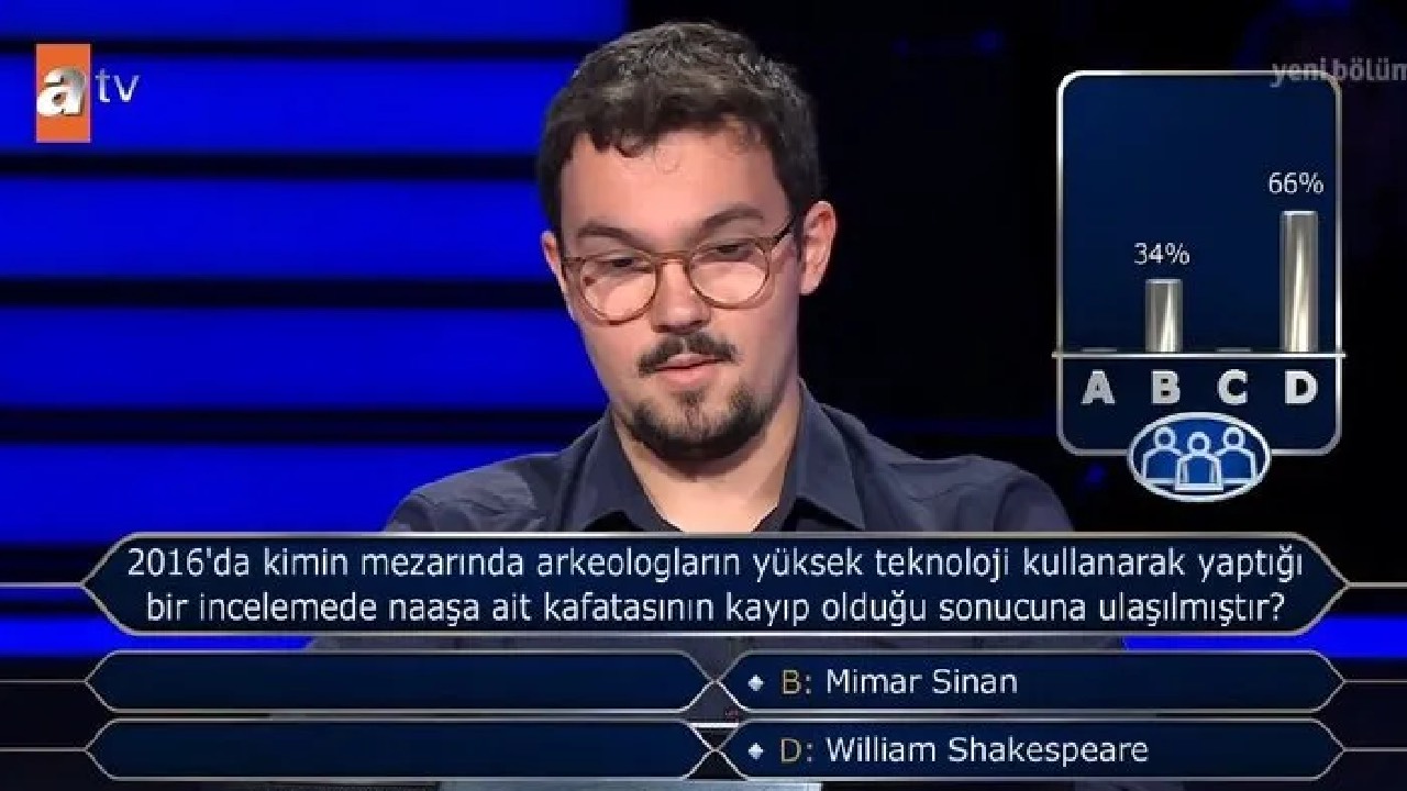 Bunun üzerine iki yanıt elenerek geriye B Mimar Sinan ile D Willeam Shakespeare kaldı. 200 bin TL'lik soru için yarışmacı kalan seyirci jokerini de kullandı. Bunun üzerine seyirciler, yüzde 34 Mimar Sinan, yüzde 66 D William Shakespeare yanıtını verdi.